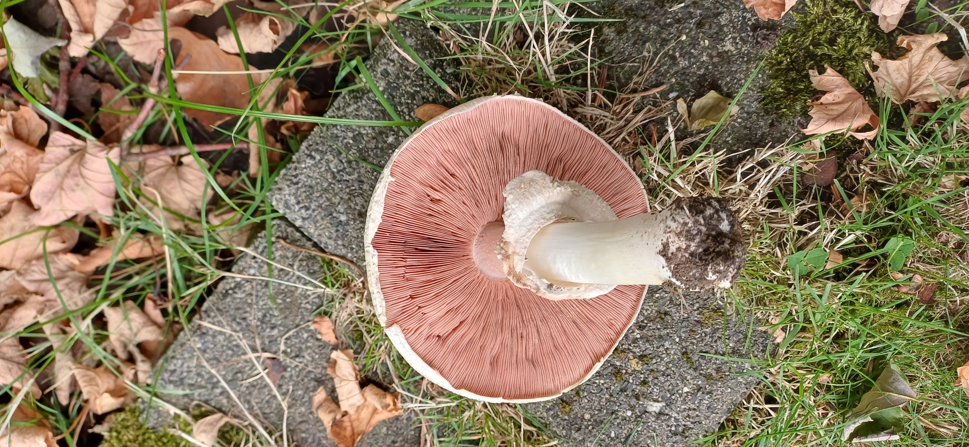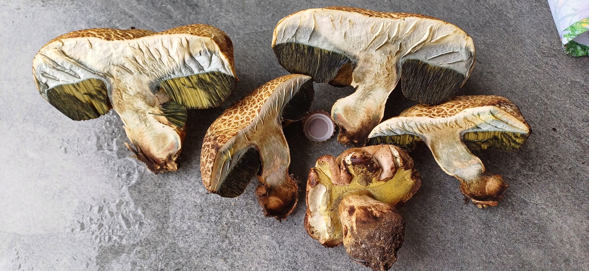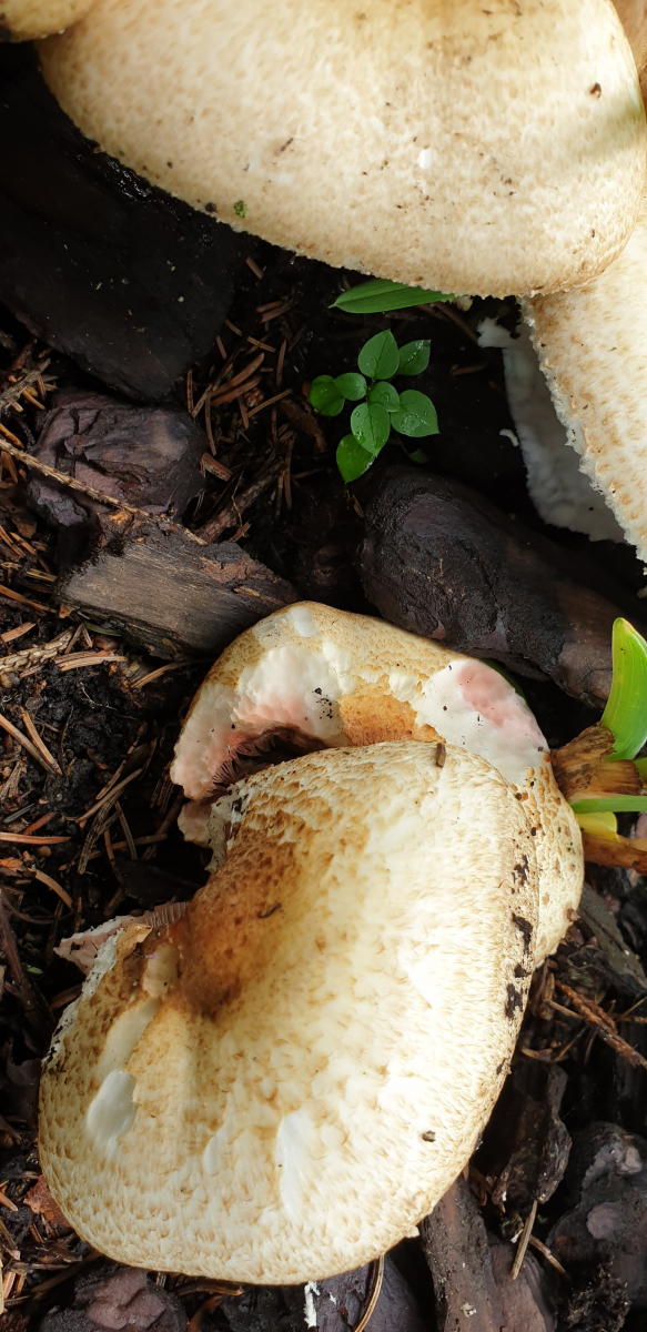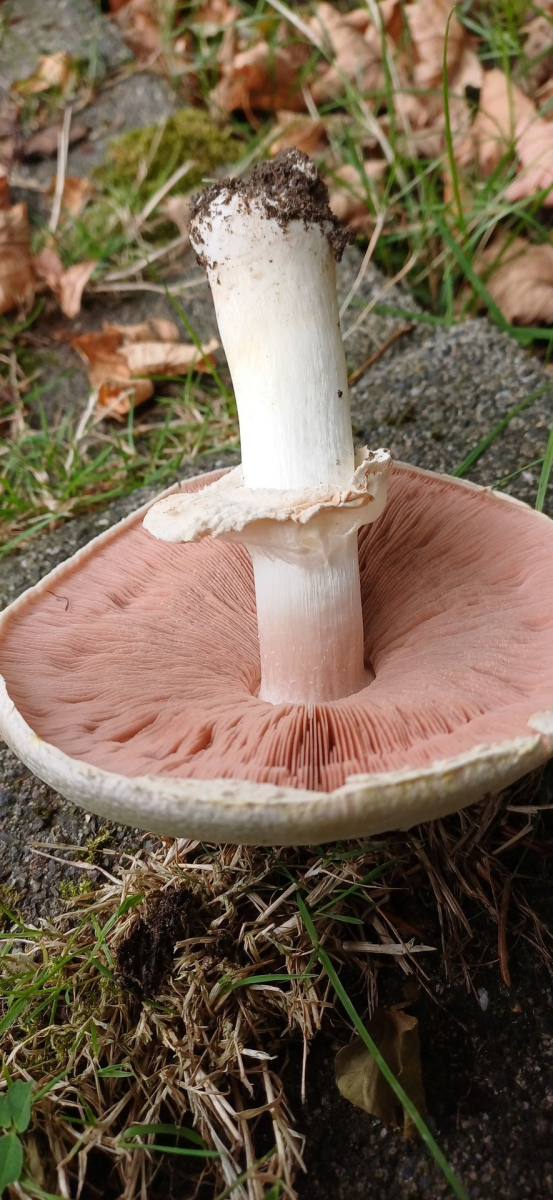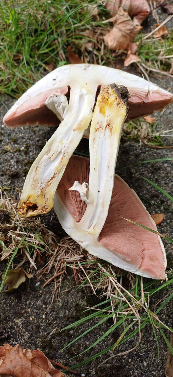 Die Bilder lege ich anbei: Fraßstellen vermutlich von Schnecken waren leicht rosa (sichtbar auf den Bildern) und nach ca.3 Stunden Lagerung auch ganz schwach der obere Stielteil - nicht die Schnittstellen. der Geruch war angenehm deutlich anisartig.