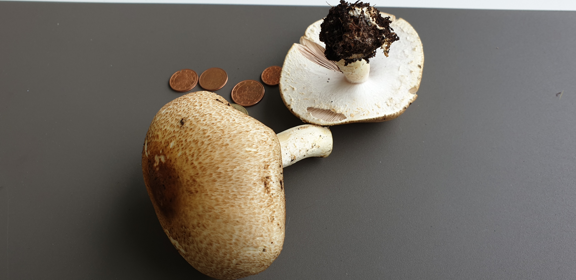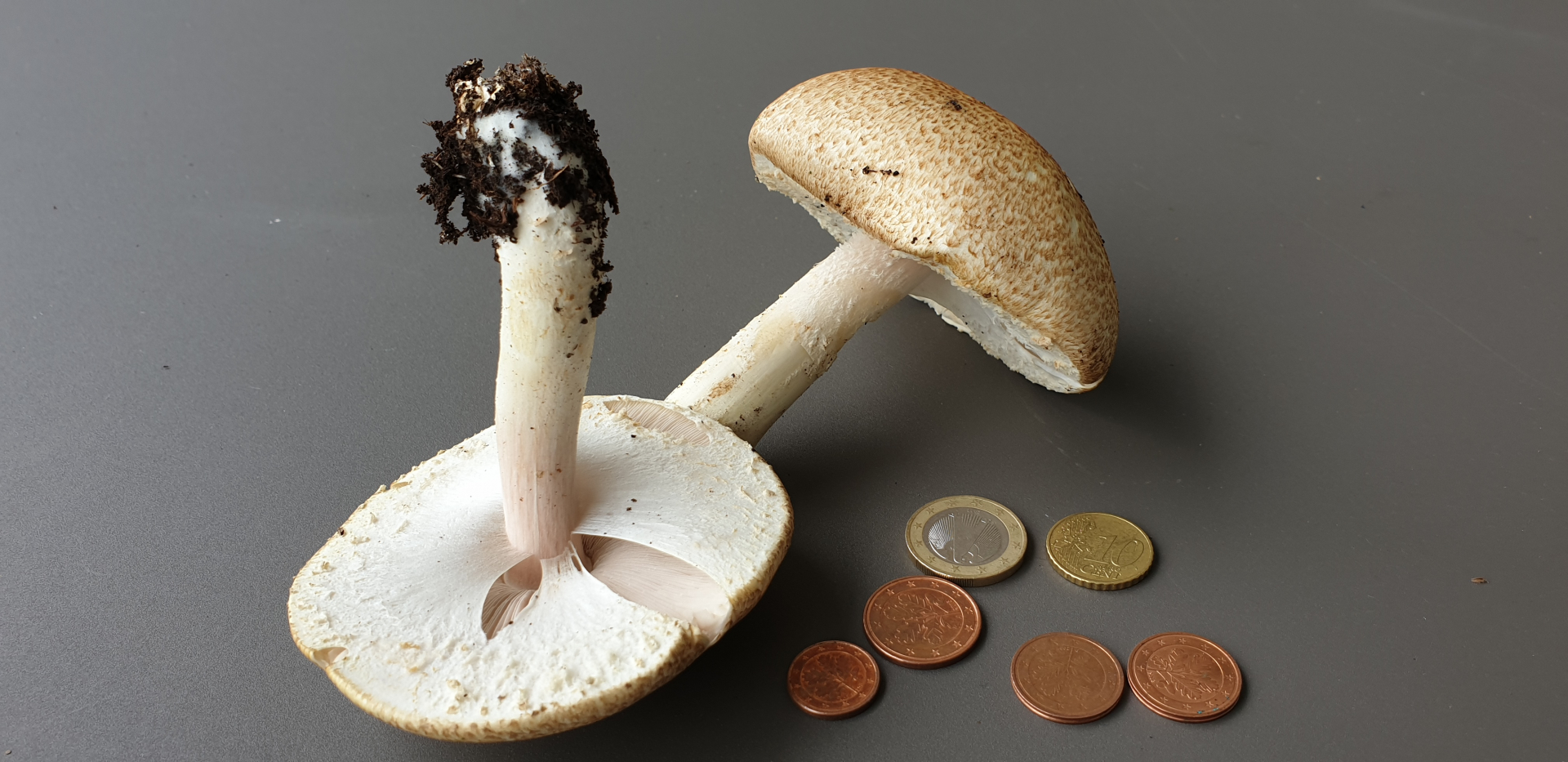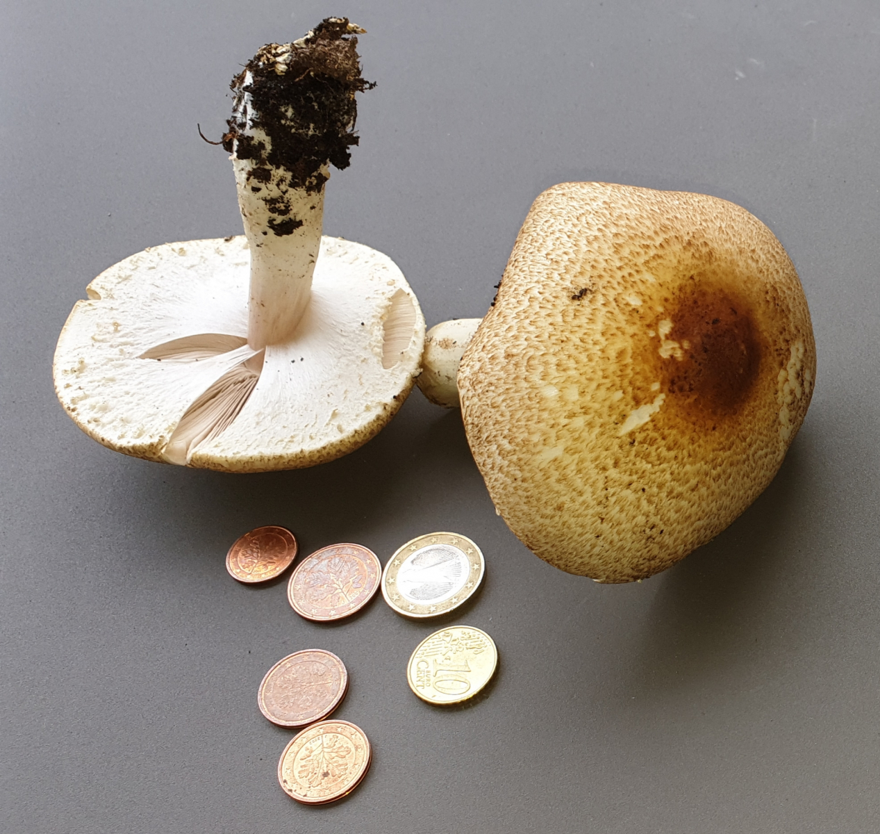 Der größere der beiden Pilze hatte heute nachmittag eine Schirmgröße von 57x52mm der Stiel war 46mm und die Gesamthöhe ca. 61mm.Da sie im Kiesbett kommen, kann man sie schwer sehen.
