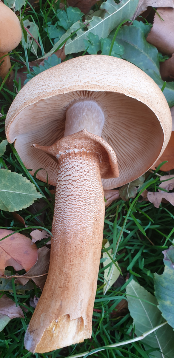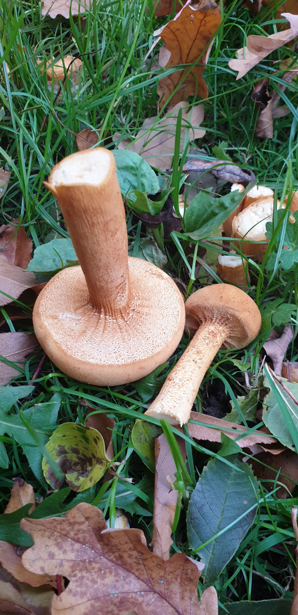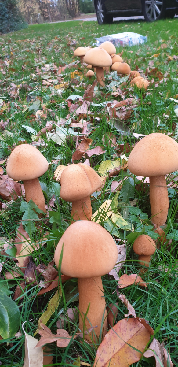 Neben der rel. wenig befahrenen Strasse zum Sportplatz inmitten eines ca.4m breiten Grasstreifens, der in eine junge Laubwaldschohnung übergeht (Birken u.v.m.), standen im Gras mehrere Kolonien dieser samtigen allseits pastellockerfarbenen Lamellenpilze mit sehr deutlichem Velum, das die kleineren Pilze noch lange völlig verschloß. Geruch: wenig, aber sehr angenehm frisch und ganz wenig fruchtig. Der Stiel ist unterhalb des Velums "genattert?" ähnlich den von Birkenpilzen - aber alles in diesem auffallend schönen rötlichbraunen Ockerton. Pilz und Stiel sind innen weiß und von angenehmer wattestyroporiger Struktur mit leichtem, angenehmem Biß und wenig, aber gutem Geschmack ohne Nachklang. Wenn essbar, müßte das ein hervorragender Speisepilz sein. Die Lamellen sind angewachsen, nicht herablaufend; Sporenpulver liegt noch nicht vor - scheint aber braun zu sein. Nach längerer feuchter Kälte ( 8 - 14 °C) war es heute für einen Novembertag sehr warm (bis 22°C) >>> und nur seht auf die Bilder>>>