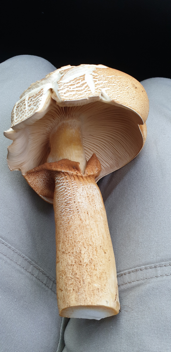 Nach dem nächtlichen Dauerregen schoß heute eine Gruppe von möglicherweise Ackerschirmlingen unter einer riesigen gemeinen Fichte in unserem Stadtgarten.