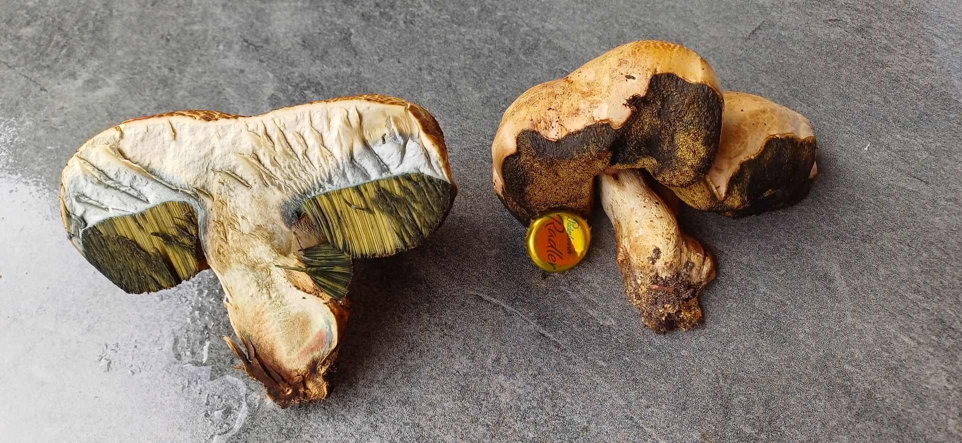 Eben fand ich in Aachen neben der Eupener Str. ca.#283 unter großen unbeachteten Laubbäumen – es war im Platzregen – zwischen Fahrradweg und Fahrbahn im Grünstreifen vier Porlinge mit Kappenbreite bis max.15cm, beim Anschnitt nicht durchgehend aber sehr deutlich mittelblau anlaufend – die Bilder entstanden ca. 5 min später, als die Bläuung schon zurückgegengen war und dunkelte. Der Geruch ist angenehm, leicht würzig, der Geschmack angenehm und nicht bitter.