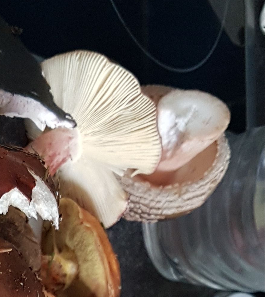 Die Lamellen sind Rosa. Der Ring hst unten kleine gelbliche Tupfen.