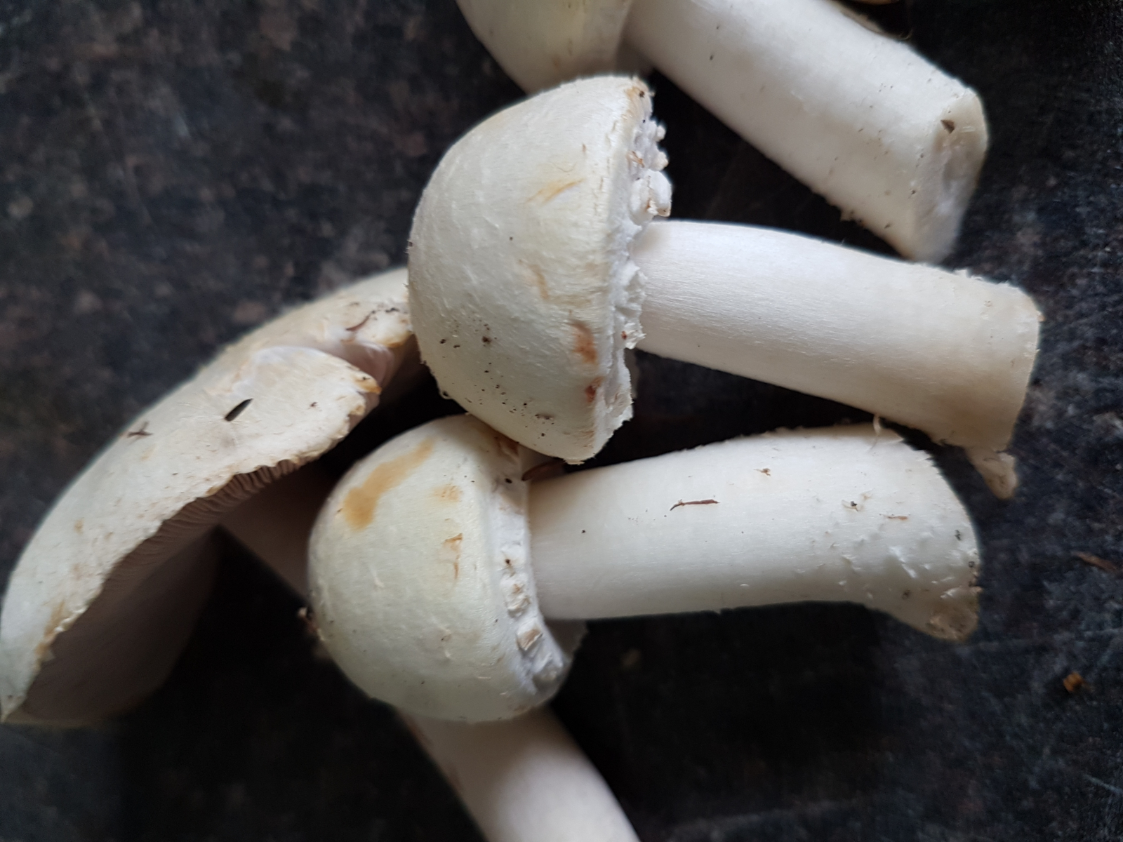 Die kleinen waren reinweiß u haben erst zu Hause eine gelbliche Färbung bekommen. Ich rieche nix von Karbol. Aber auch nicht Anis Egal wo ich schnuppere . Die Verfärbung am Stiel ist eher aprikosefarben als Gelb. Die Knollen hab ich gesehen aber mir nicht gemerkt wie sie waren. Seufz.