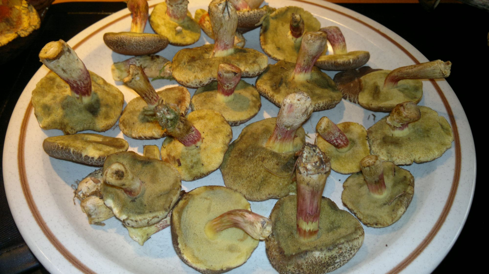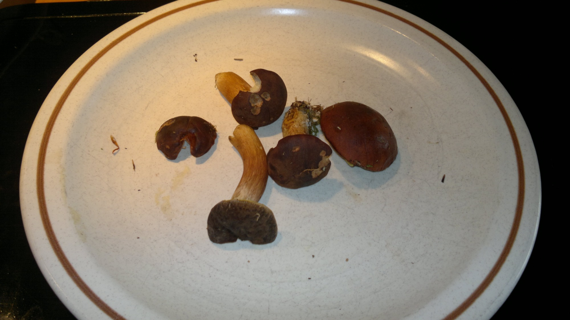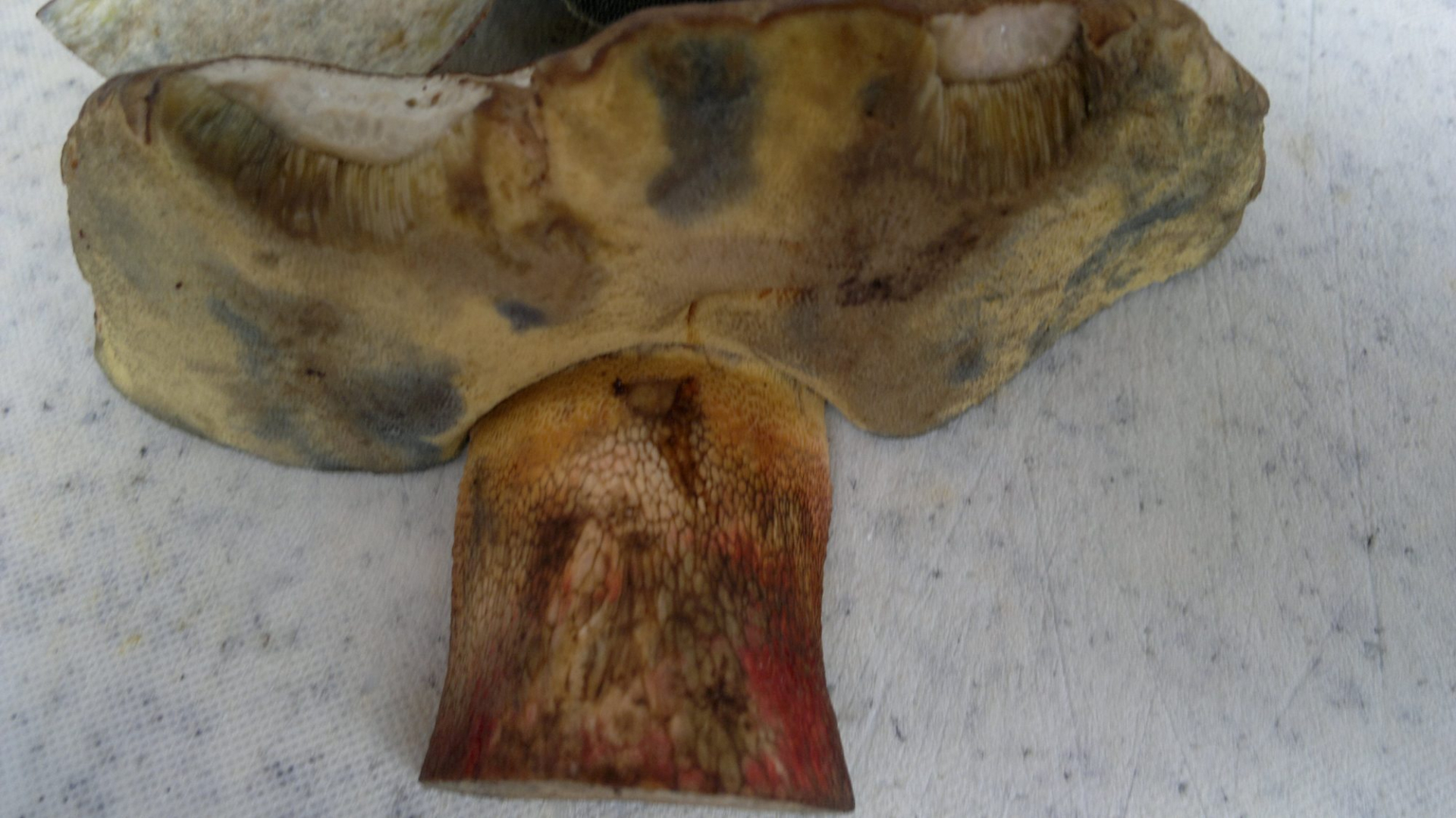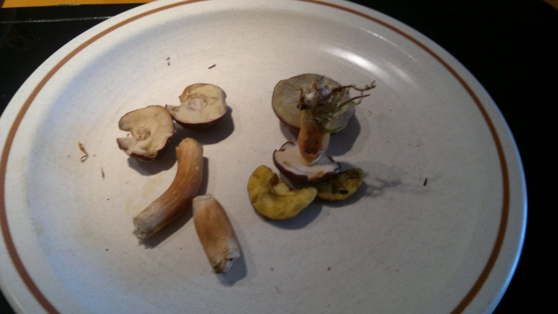 2. Ein Rätsel für mich, von weitem ein Steinpilz (Hutfarbe), beim näherkommen eine Hexe (roter Stiel), vom Schwamm und Schnitt ein Maroni (Blau färbend), vom Stiel her ein Gallröhrling (Netzzeichnung)