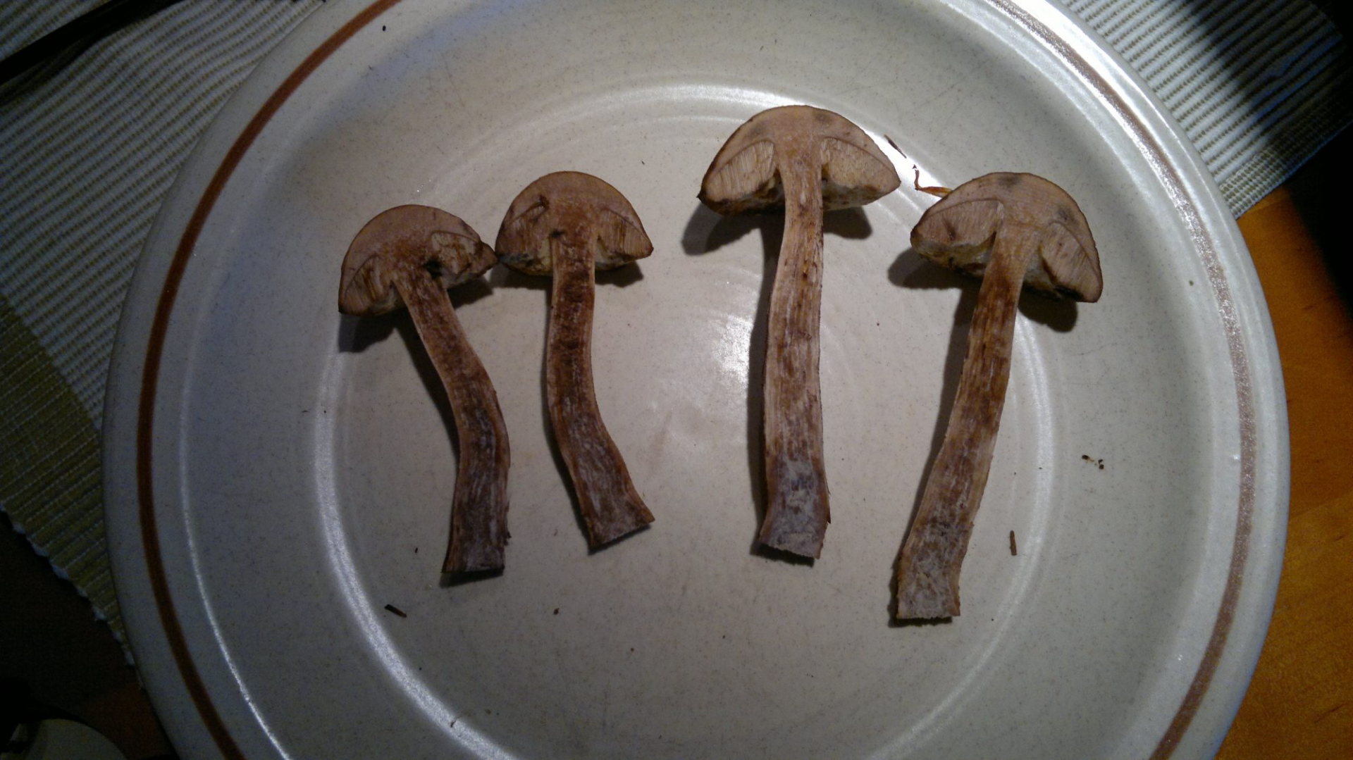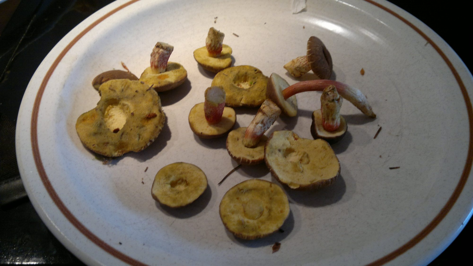 Ich habe die Pilze zum trocknen geschnitten und sammle keine Rotfüße mehr, die meisten waren bewohnt, glücklicherweise war die Hexe wenigstens ertragreich. Trotz allem war das mein bester Fund dieses Jahr, bis jetzt fand ich vorher eine Hexe, 4 Rehe, viele Frösche, 100 Gallier, einen Schönfuß und sehr viele Schnecken.