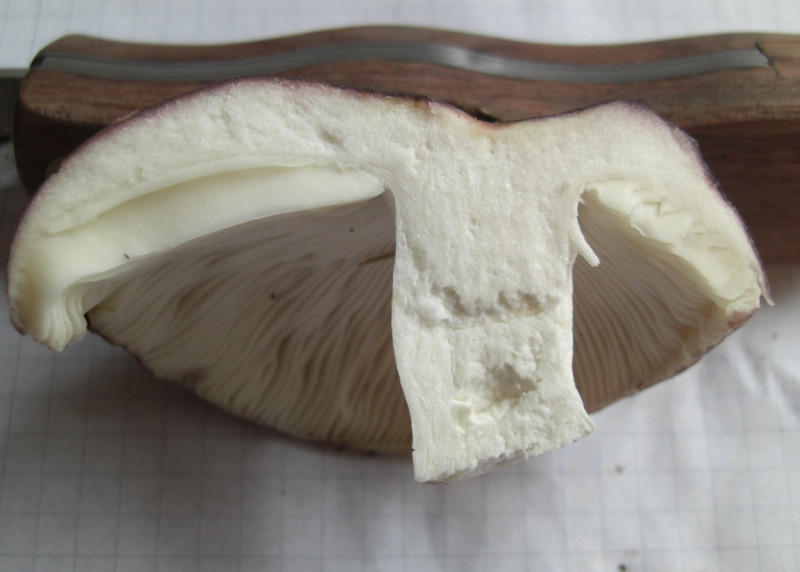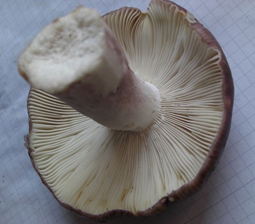 nee, ist wirklich ein Täubling mit den frauentäublingtypischen elastischen Lamellen. Nicht splitternd. Der Geschmack ist, wie schon erwähnt, mild. Stiel ist halt lila überhaucht. Neben diesem Exemplar war der kleine Bruder, dessen Stiel komplett weiß war.