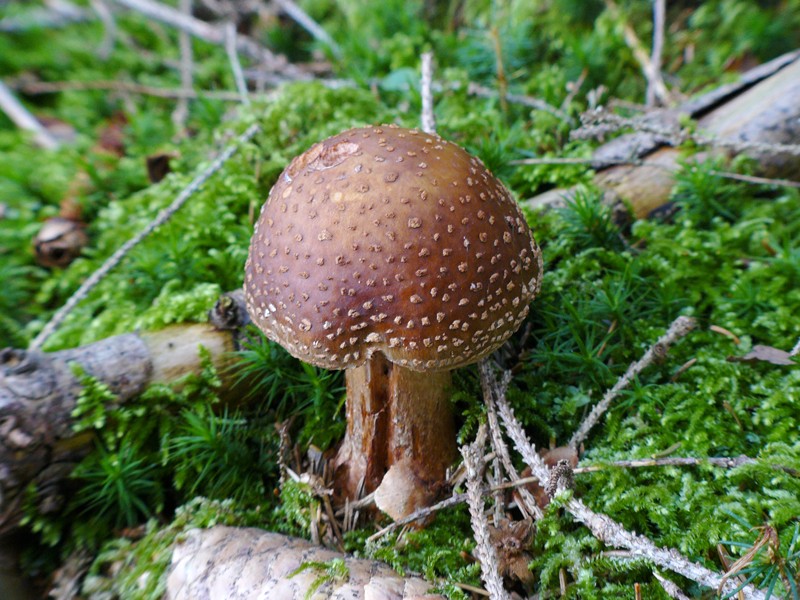 ! Wirklich trocken oder alt war der Pilz nicht, eigentlich sogar noch sehr frisch, nur der Stiel wirkte tatsächlich schon etwas verholzt. Neben der sehr ungewöhnlichen Färbung und Gestalt, hat mich vor allen irritiert, dass es der einzige Pilz dieser Art weit und breit war. Einzelne Perlpilze habe ich bisher noch nie gesehen und Pilze wuchsen dort wirklich in großen Mengen.