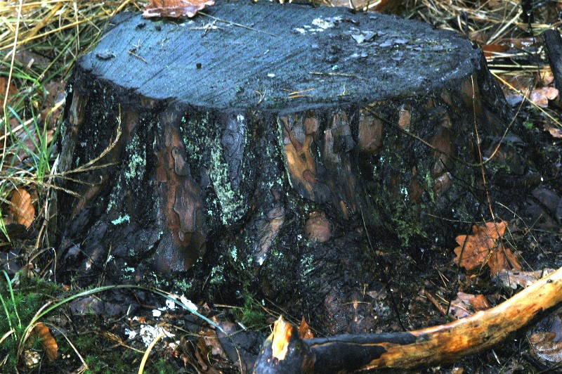 nur kurz, später vielleicht mehr. Ich hatte einen Hausbesuch, der mich an dem Waldstück vorbeiführte, da konnte ich es nicht lassen, den Baumstumpf zu suchen. Definitiv nicht Kiefer, die Felderung der Borke ist deutlich kleiner, aber irgendwie paßten mir die umstehenden Eichen auch nicht so recht, kommen am ehesten hin. Lärchen sind mir dort nicht bekannt.