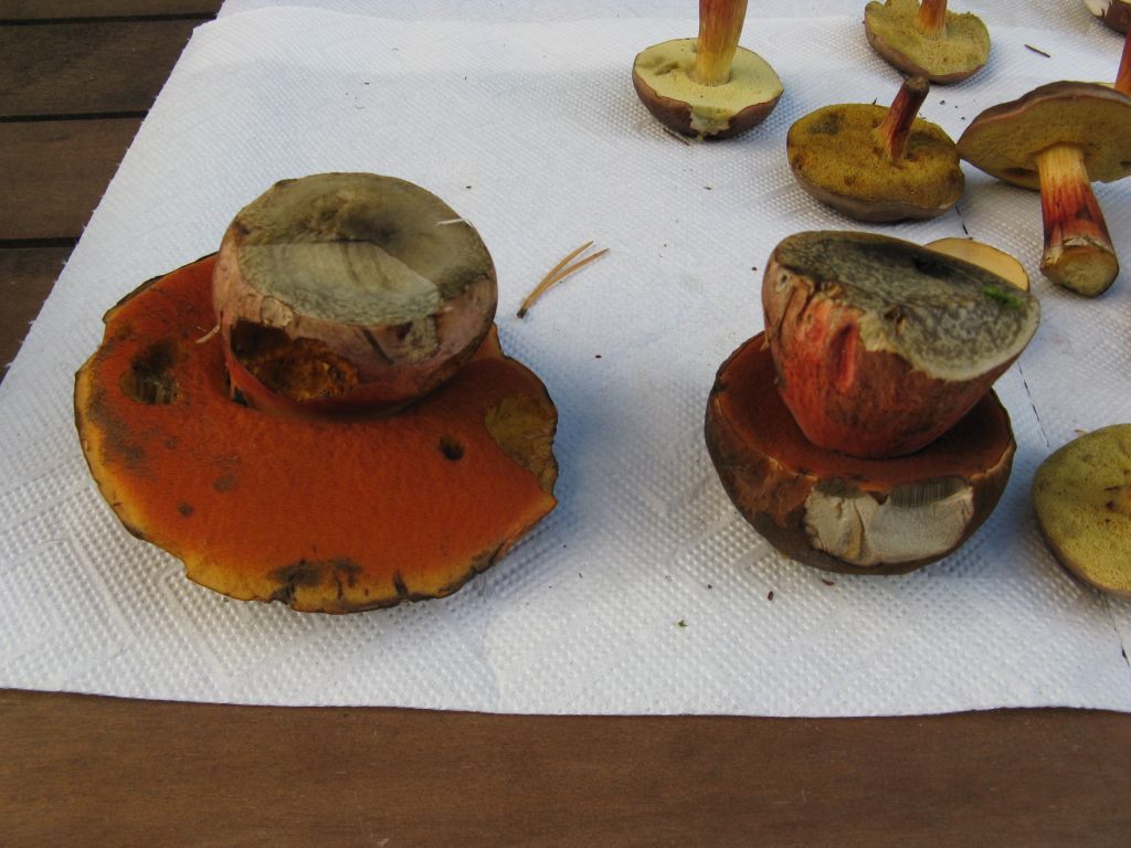 bei den Rotfußröhrlingen fehlen durchweg die Risse in der Kappe, die überall erwähnt werden. Außerdem werden die Röhren beim Eindrücken nur ein wenig dunkler, nicht blau und das Fleisch der Kappe verfärbt sich nach dem Anschnitt gar nicht.