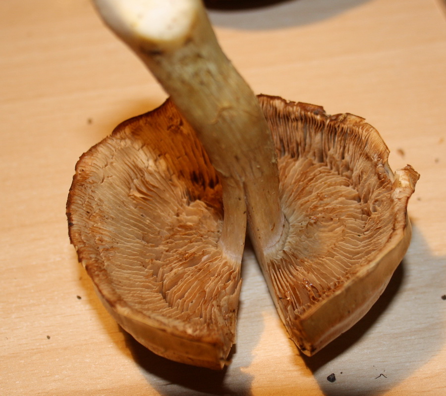 Pilz 5 habe ich doch ein Foto von oben und eines mit den Lamellen. Die Hüte sind 10-12 cm groß.
