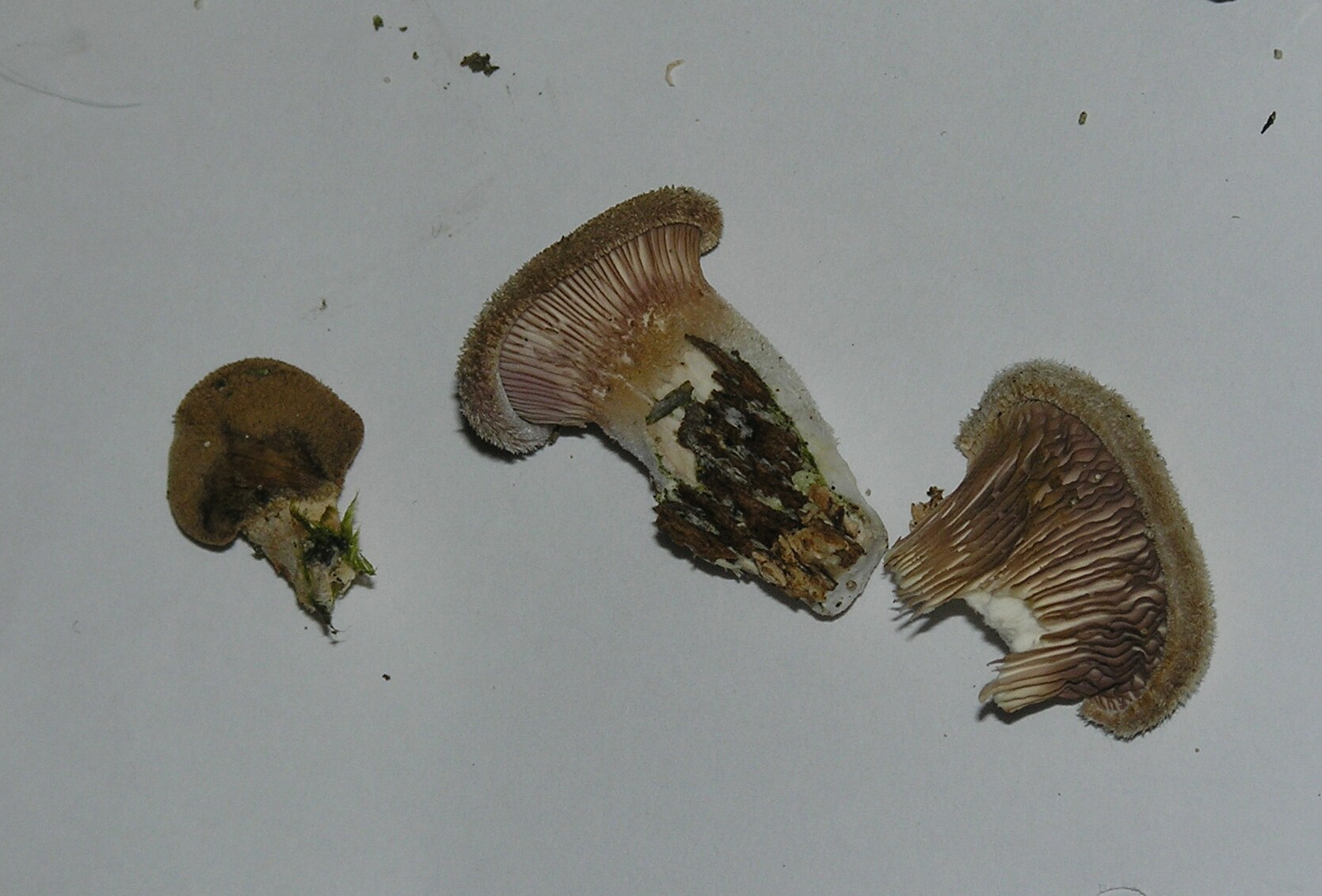 Oberfläche des Hutes im Zentrum samtig, zum Rand hin leicht borstig/filzig, der Stiel ist ebenfalls leicht rau. Der Stiel geht von unten nach oben (zum Hut hin) von weiß leicht ins ocker/bräunliche. Die Lamellen erscheinen braun (eventuell ein leichter violett Stich)und laufen am Stiel herab. Bei machen Pilzen war ein zentraler, bei anderen ein lateraler Stiel vorhanden.