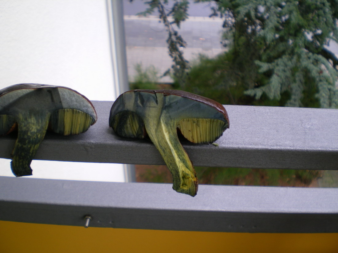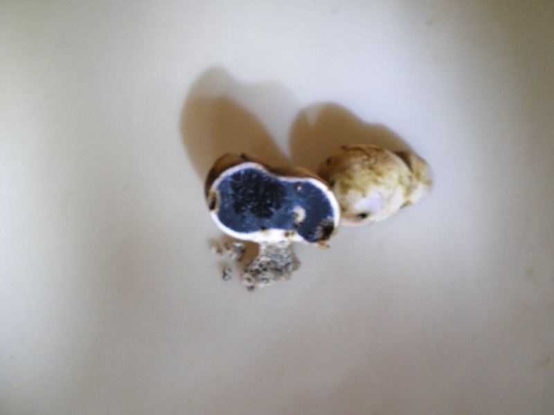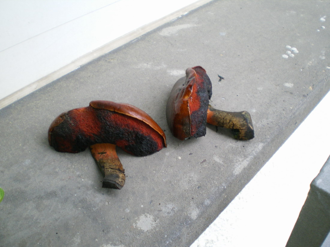 Hi all, diesen Pilz habe ich Grad abgeschnitten, er war unten rot und oben glitschig (slimy), wo meine Hände oder Finger waren ist er jetzt schwarz. Den Stiel habe ich geschnitten und er war hellgelb, aber innerhalb Sekunden war er dunkleblau. Warum ist das so? Weiss das jemand? Ich werde es nicht essen, aber ist er geniessbar?
