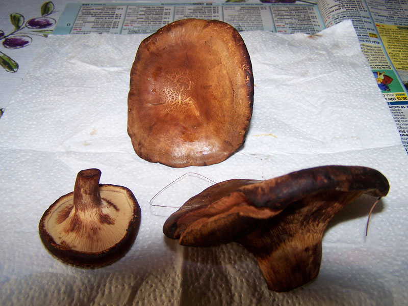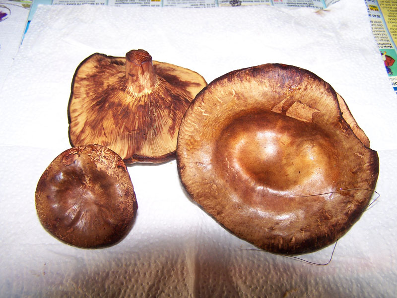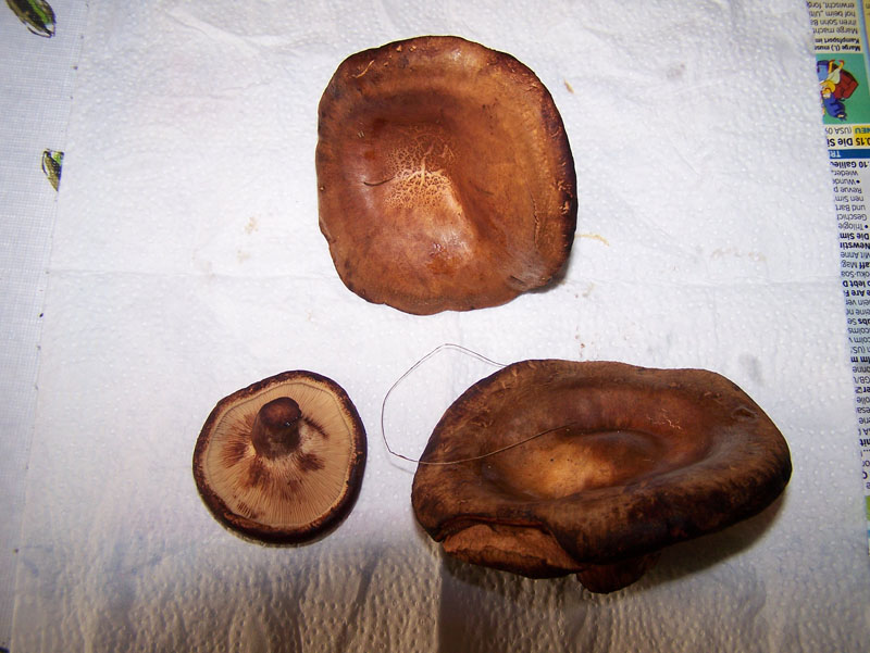 Daneben waren ziemlich gleich aussehende Pilze mit Unterschied, dass die heller sind und Rand nicht nach unten abgerundet sondern gerade. Leider habe ich kein gutes Foto. Aber Profis können es trotzdem erkennen.
