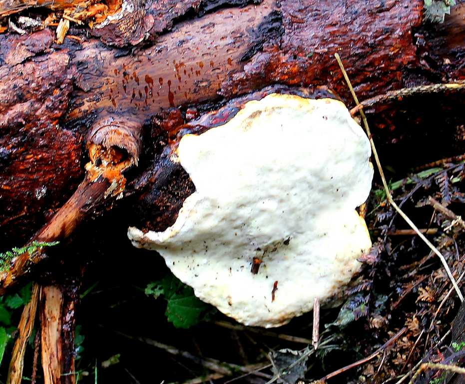den ersten Pilz habe ich auf einem liegenden Baumstumpf entdeckt. Er liegt im Fichtenwald. Leider kann ich nicht sagen, was für ein Baumstumpf