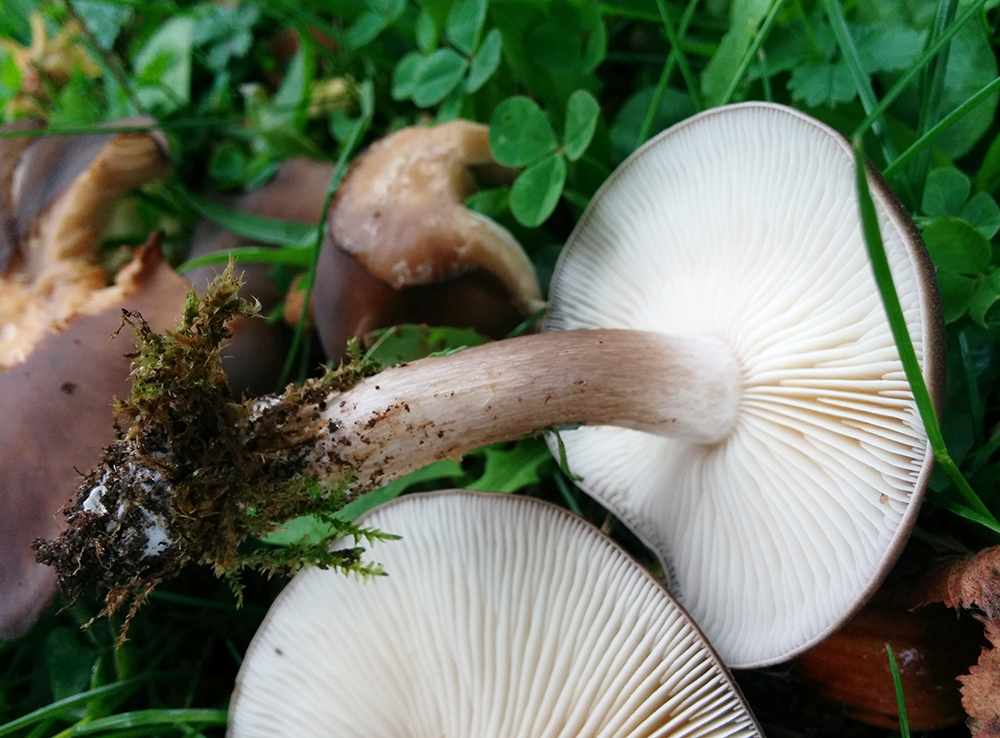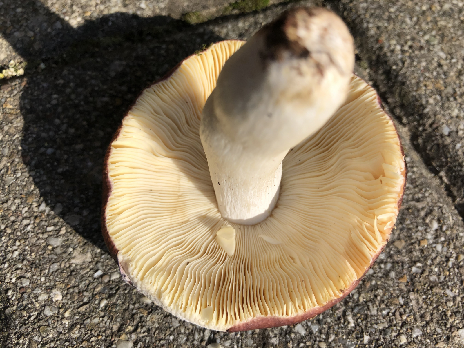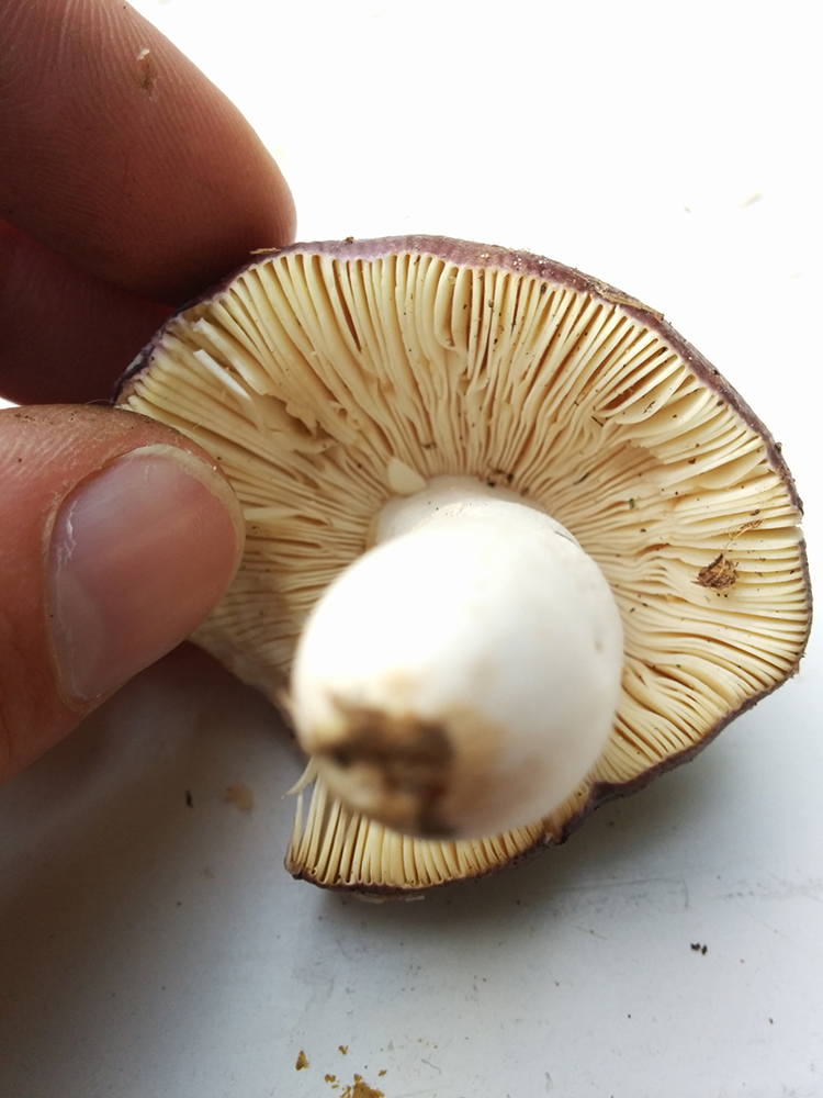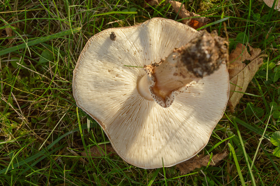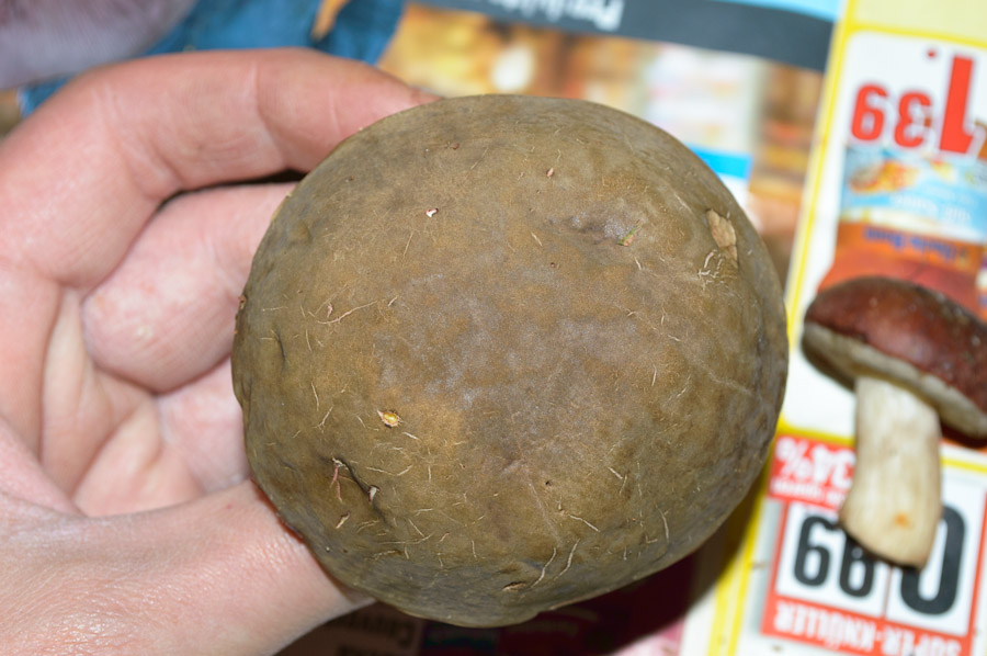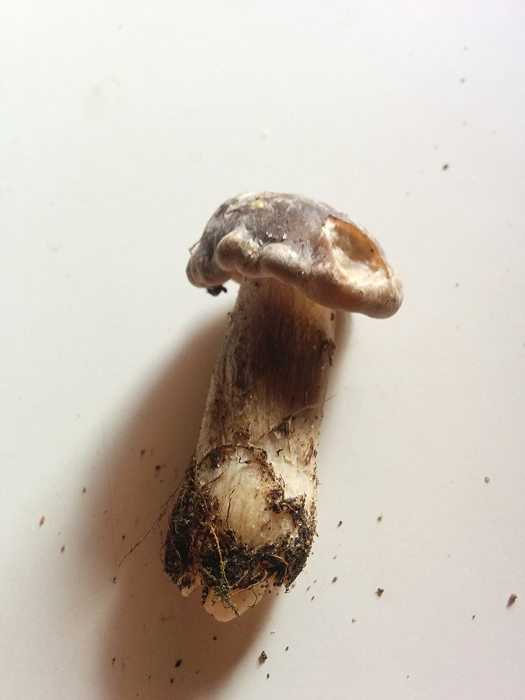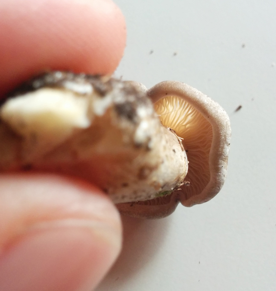 Der Pilz ist relativ klein, etwa 4,5cm gesamt. Er ist sehr fest, fühlt sich an wie ein Steinpilz, die Kappe hat ein gräuliches Dunkelbraun, die Lamellen sind ganz leicht cremefarben und nicht am Stiel angewachsen.