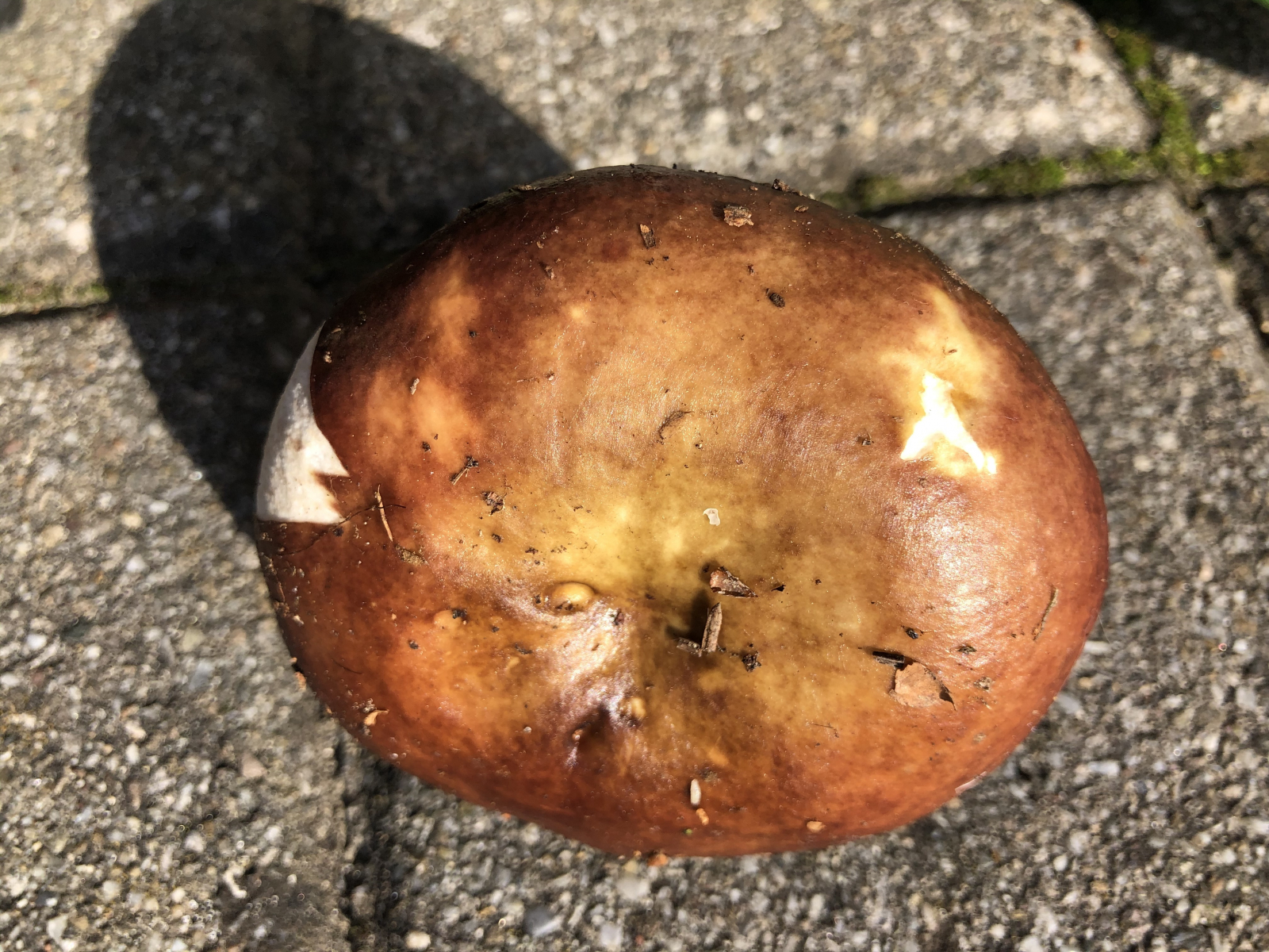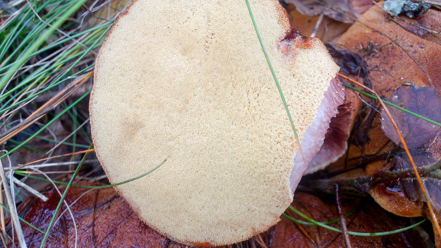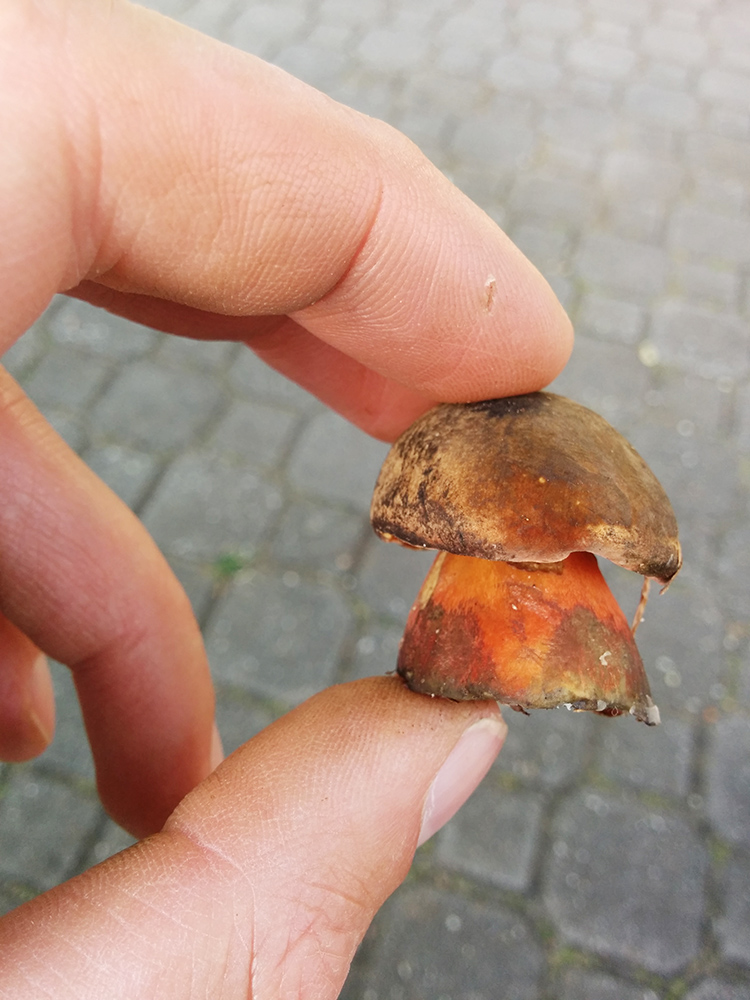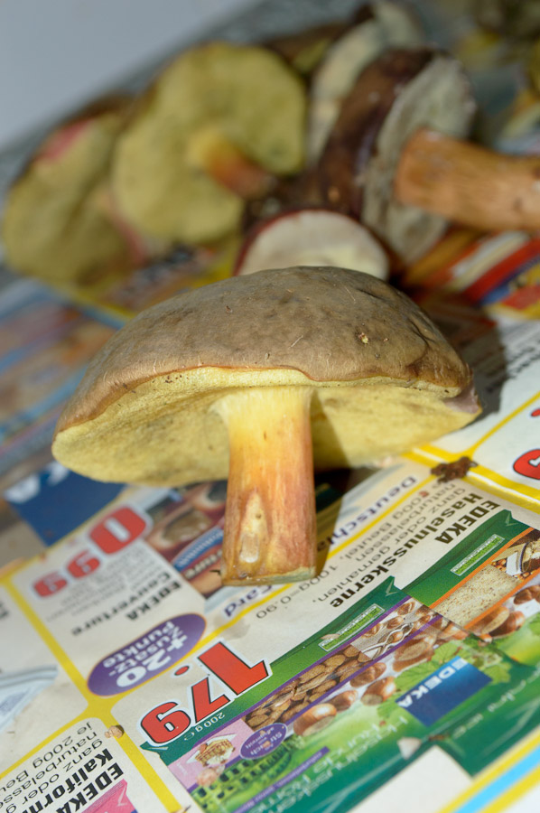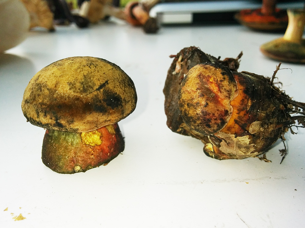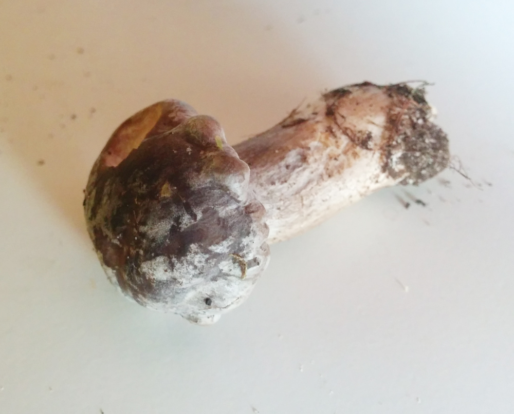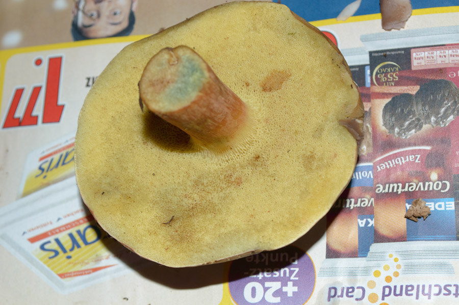 Und zum Schluß etwas angeblich sehr seltenes. Eigentlich hielt ich den Pilz für einen Satansröhrling wegen der relativ hellen Hutfarbe, betrachtete ihn aber genauer und meine, hier einen glattstieligen Hexenröhrling gefunden zu haben. Er blaut extrem schnell und sehr deutlich, der Satansröhrling soll da moderat sein, außerdem hat er keine Zeichnung am Stiel, eher eine Art Samt. Nachdem ich den größeren Fruchtkörper abgeschnitten hatte, nahm ich doch noch die Basis mit, was auf dem Foto zu sehen ist.