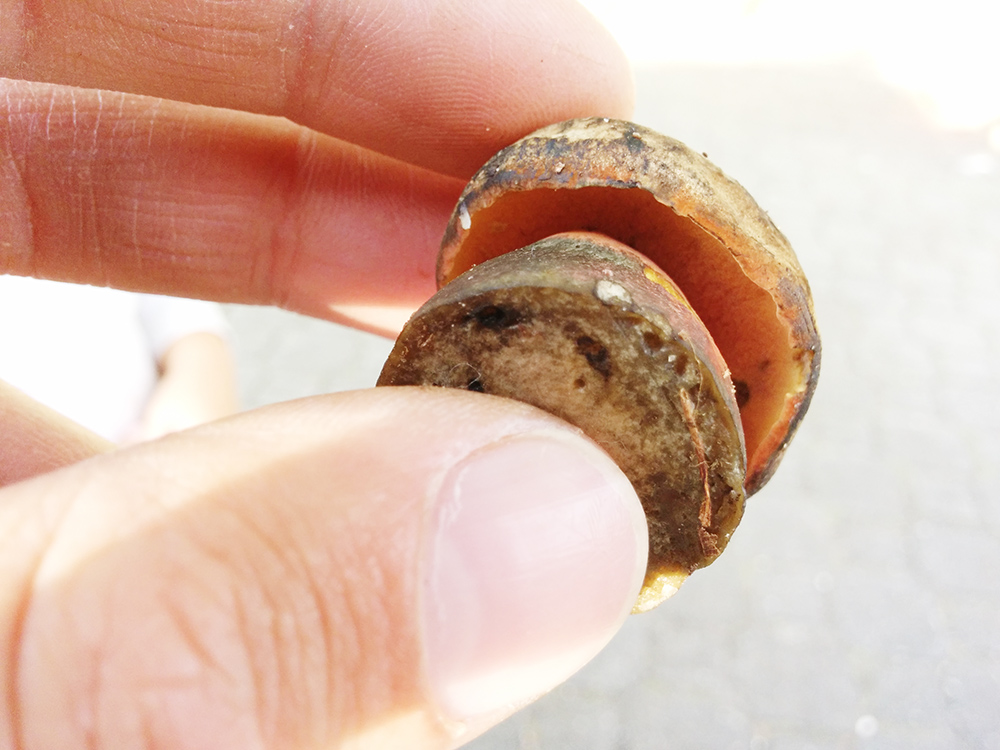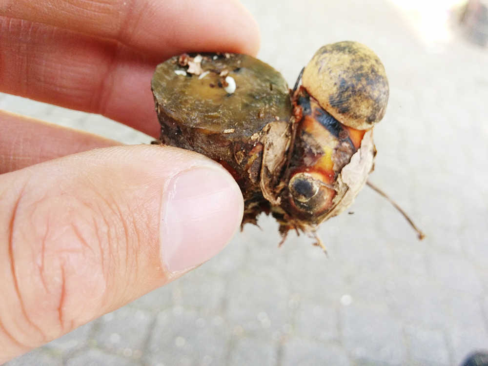 Hätte nie geglaubt, dass man das fleischige Teil essen kann, wobei ich las, ältere Exemplare seien nicht zu empfehlen. Habe es sowieso liegen gelassen, die schleimige Oberfläche hätte mir den ganzen Beutel versaut ;).
