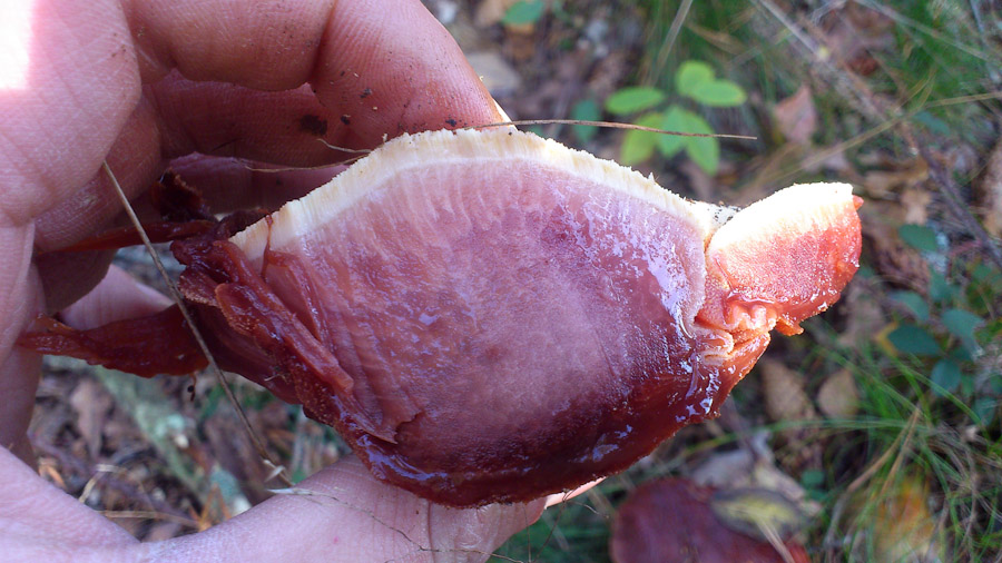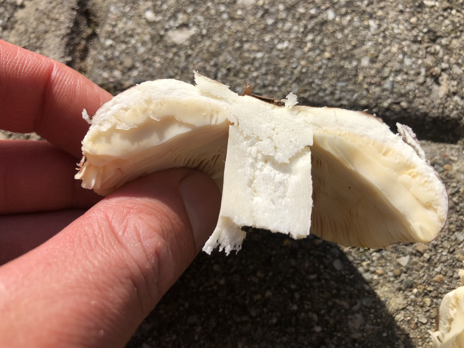 Huthaut lässt sich zu einem Drittel abziehen, der Stiel ist weiß und brüchig, die Lamellen etwas ins cremefarbene gehend. Die Lamellen sind nicht brüchig, der Stiel schon.