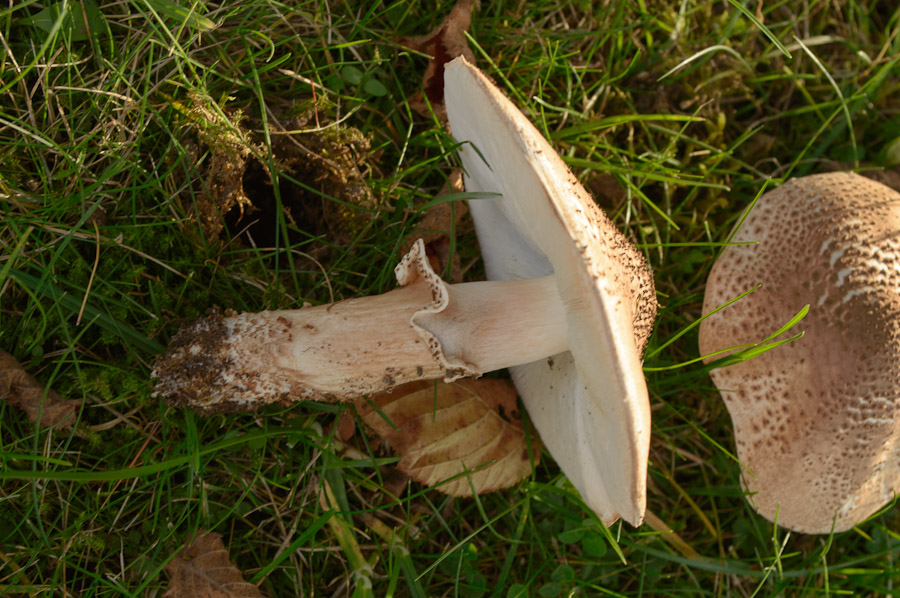 Den echten Safranschirmling hatte ich auch schonmal (bin damals mit meinem Fund zu einem eingetragenen Experten gefahren und ließ mir das bestätigen) und ich meine auch, dass da die Grundfarbe des Hutes dunkler war. Bei dem Ring bin ich mir nicht sicher, meine aber, der war verschiebbar. Bei diesen Exemplaren hier scheint mir zumindest bei dem jungen Pilz der Ring doch doppelt zu sein, siehst Du das anders?