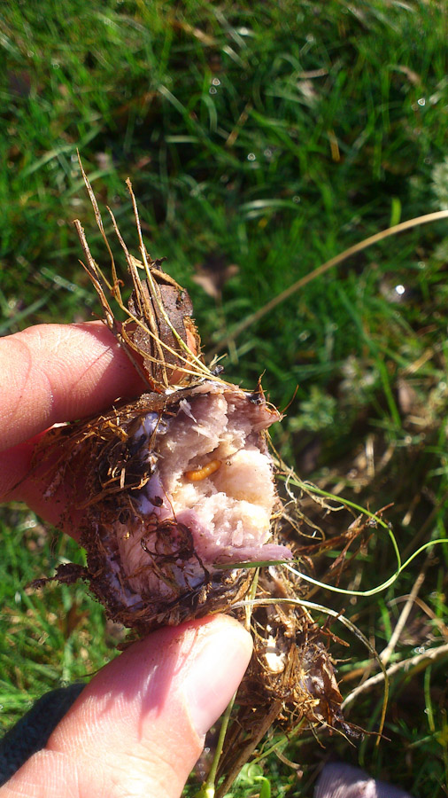 Spannend finde ich auch folgendes Gerät. Standort direkt an einer sehr alten Eiche, möglicherweise auf deren Wurzel (Basis recht tief unter der Erde, ist unter der Erde abgebrochen). Das ganze Trumm war ziemlich schwer, sicher 2 Kilogramm, die Oberfläche ist schleimig, die Poren fest, Geruch nur sehr schwach. Was ist das für ein Ding? Das letzte Foto ist ein Schnittbild auf dem Kopf.