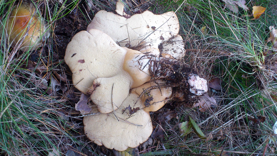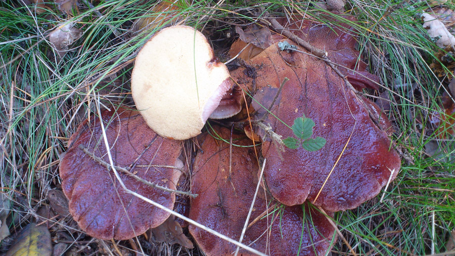 Und zuletzt noch ein Röhrling, den ich für eine Ziegenlippe hielt, scheint mir aber doch was anderes zu sein. Standen in einer kleinen Gruppe unter zwei jungen Buchen, außen herum wieder hohes Gras, andere Bäume etwa 20 bis 30m entfernt.