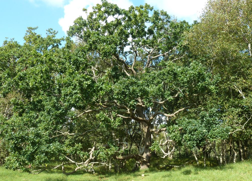 Diese Lichtung wurde außer von den unumgänglichen Moorbirken von einigen Eichen umkränzt, von denen eine eine beachtliche Schönheit war. Lange, starke, sich eichentypisch windenden Substämme, die an den Astspitzen mit geballter Lebendigkeit in gesunde dunkelgrüne, engsitzende Blattbüschel mit massig Eicheln ausbrachen. Dabei war der Baum in seiner Gestalt geradezu grazil und elegant. Hier stoße ich mal wieder an die Grenze der 2D-Fotografie, und wieso ich eigentlich so ungern Fotos mache, die das Objekt dann doch nur mehr als ungenügend wiedergeben können *seufz*