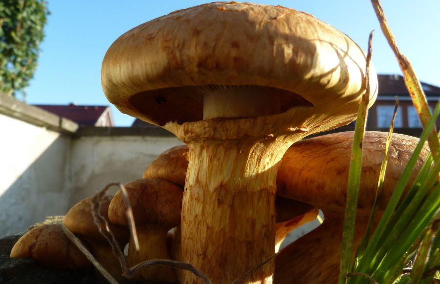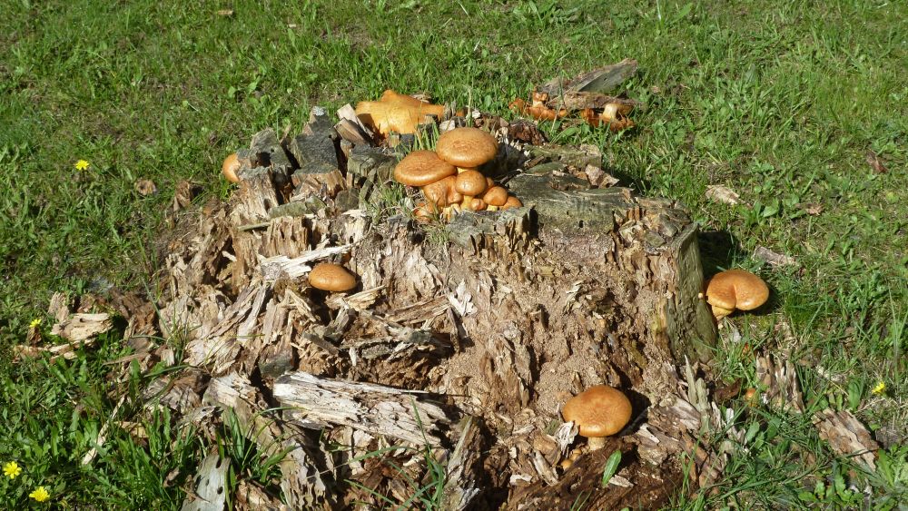 Holzart ist unbekannt. Der Hallimasch ist es schon mal nicht, die älteren Exemplare auf der abgewandten Seite hätten einander wohl weiß bemehlt...
