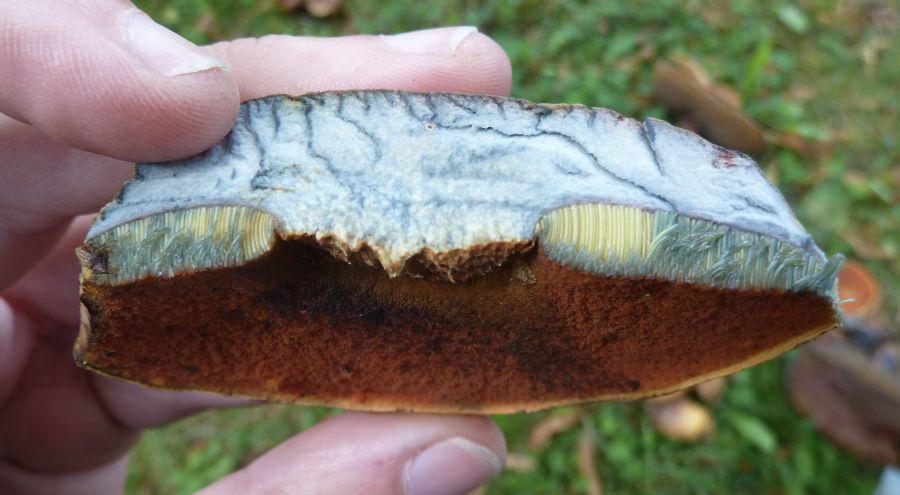 Was mir wohl gerade einfällt: der aufgebrochene Pilz oben hatte dort gut 20 Stunden so gelegen, den hatte ich nämlich am Vorabend gepflückt und zerlegt, um ihn zu betrachten. Hätte die Farbe eventuell umschlagen sollen?