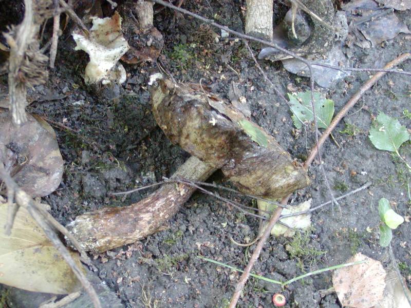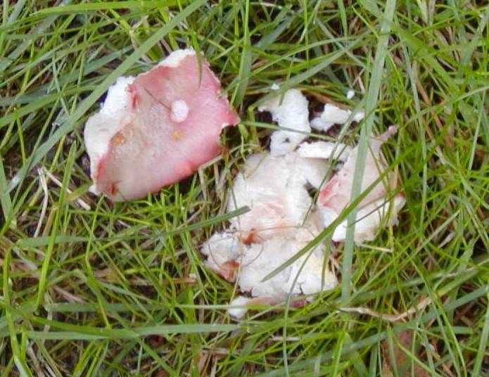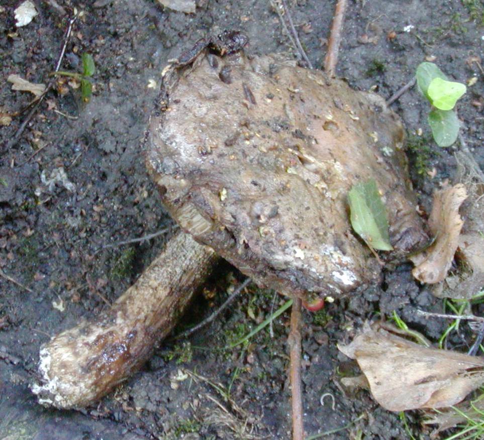 Das eine ist wohl der Ritterling vom Hexenkreis, dann habe ich an dem Reisighaufen noch das offensichtlich weggeworfene, handgroße, leider schon völlig vergammelte Exemplar eines Röhrenpilzes gefunden (und im Hintergrund steht da auch noch sowas kaputtes, dickstieliges, das nicht zu den anderen passt) und in der Wiese noch einen leider zerstörten roten Pilz, möglicherweise ein Fleischroter Speisetäubling.
