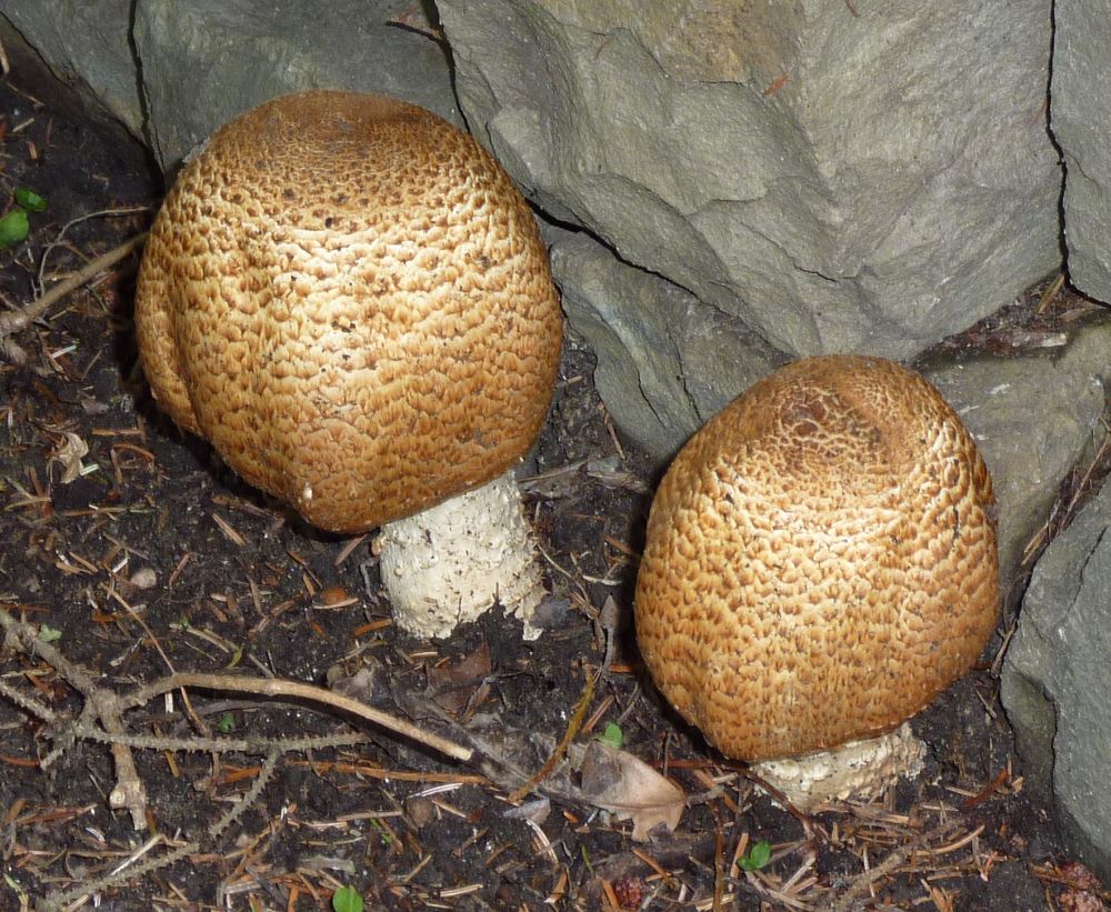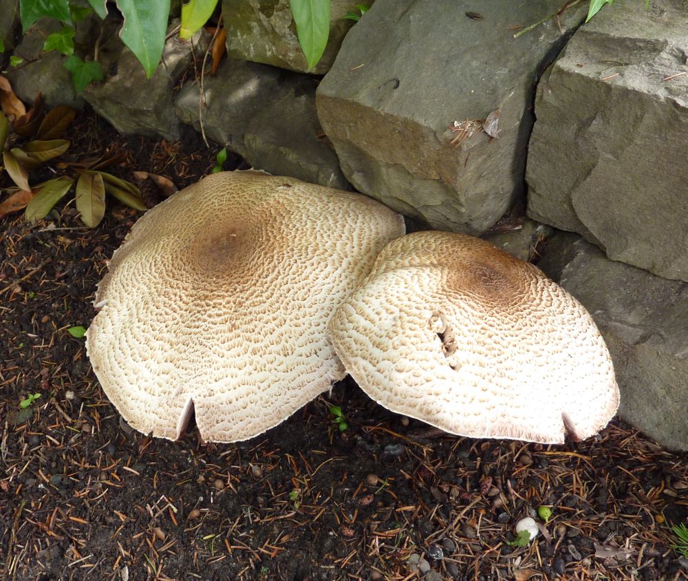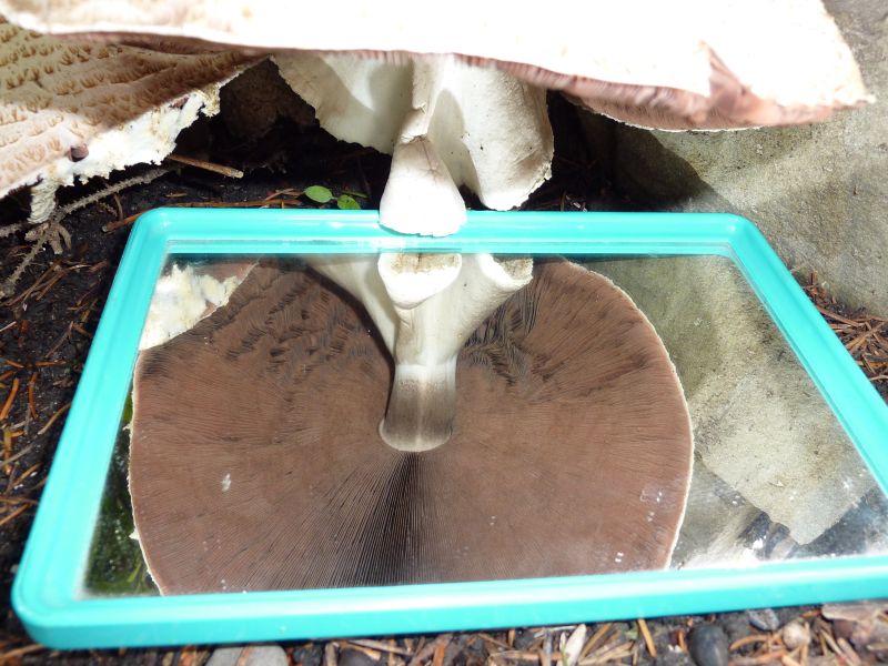 Im Nachbargarten stehen diese um die 20cm großen Pilze in einem Beet mit Nadelstreu unter einer Fichte. Wir möchten sie nicht pflücken, aber ich hoffe, ich habe mit einem Spiegel genügend "erhellen" können.
