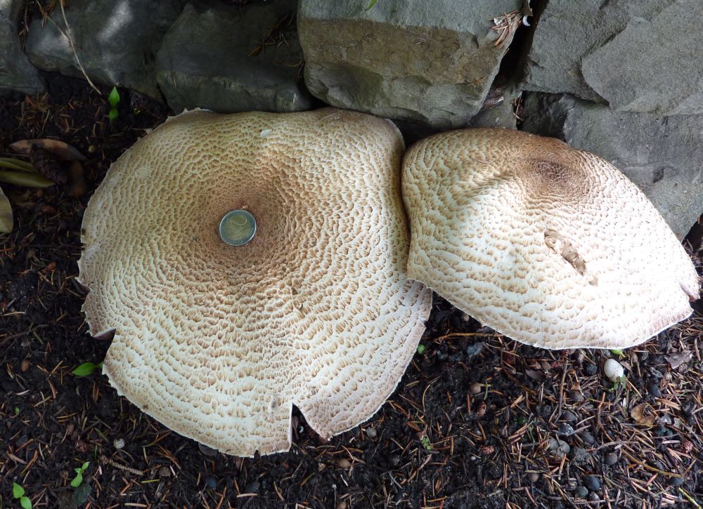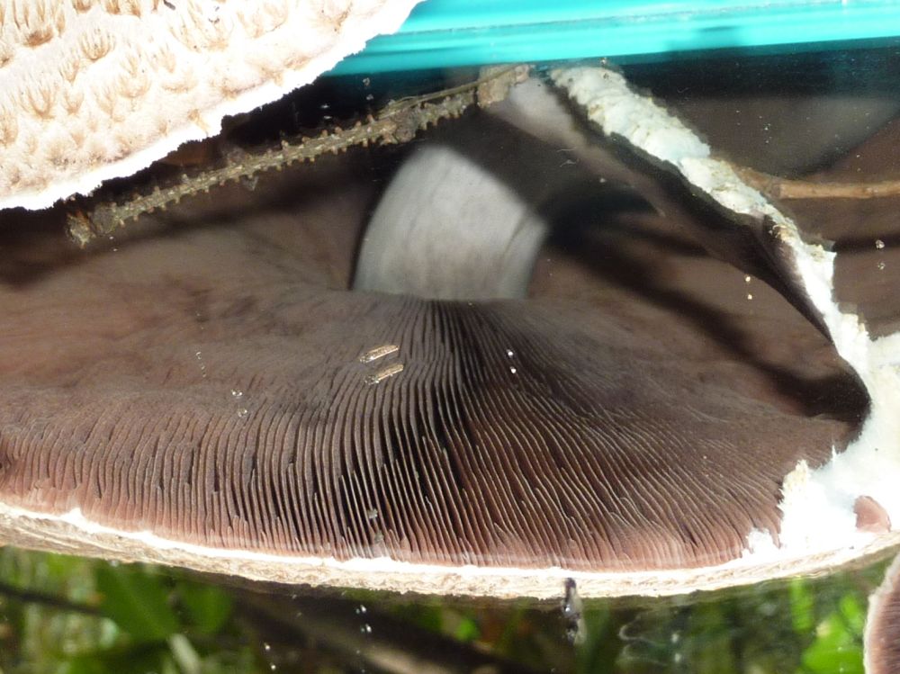 Die Lamellen sind schön fein, am Rand mit Zwischenlamellen, und sie sind braun, sonst hätte ich den Büscheligen Egerlings-Schirmpilz vermutet. Für einen Parasol ist der Hut IMHO zu glatt.Was meint ihr?