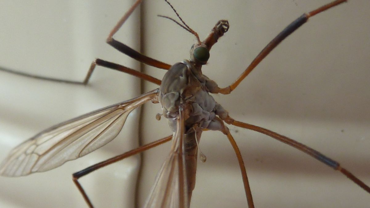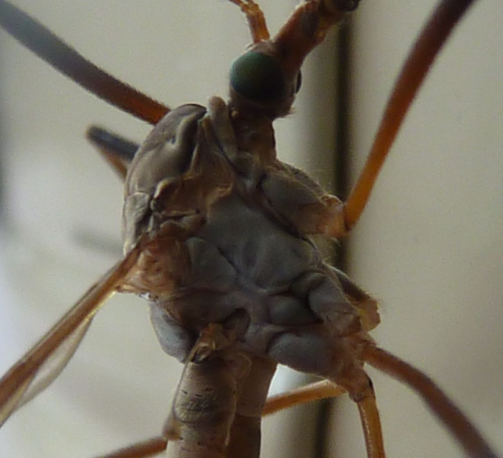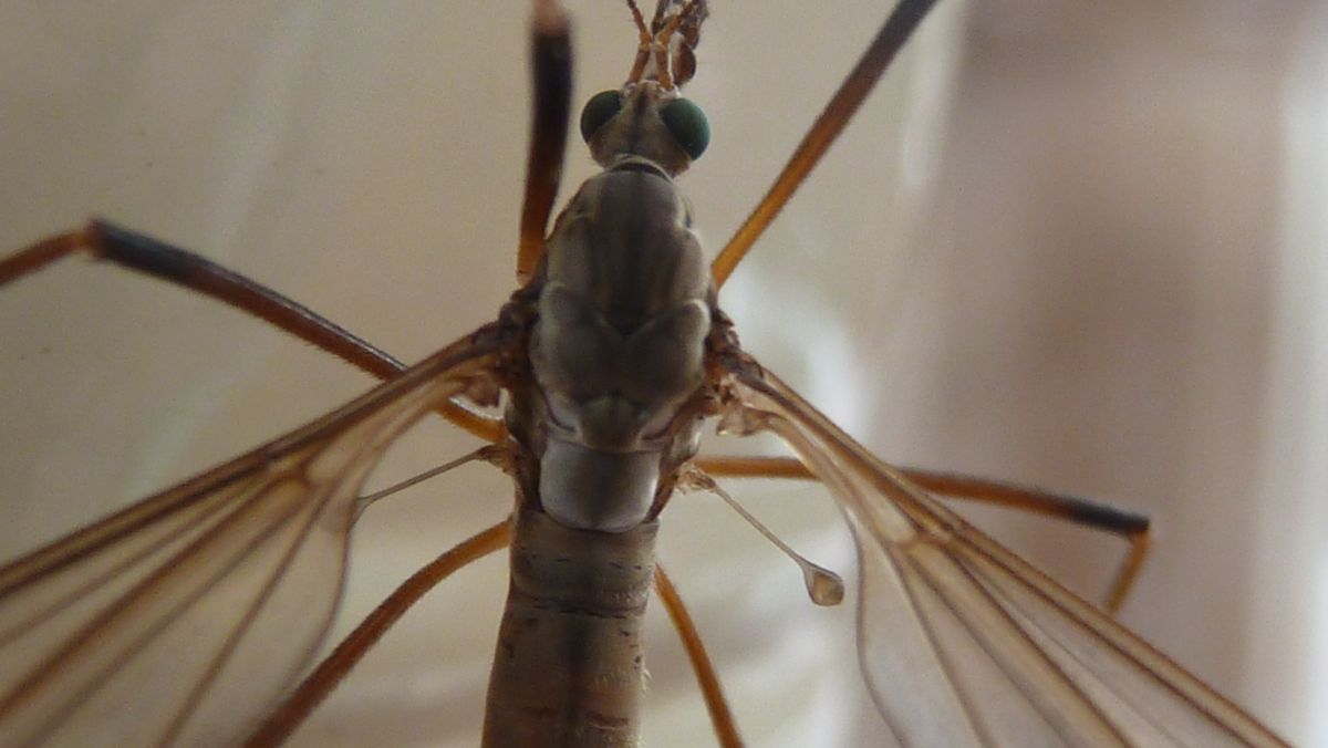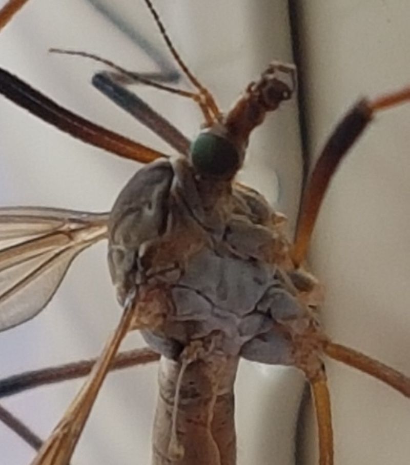 Am Blumentopf auf dem Restauranttisch saß ein Schneider (Schnake). Na, wenn er mich schon lässt, und ich nach der Essensbestellung eh erst mal Zeit hatte, schaute ich ihn mir doch mal etwas genauer an.Und zückte dann die Kamera. Der Vorderkörper sah irgendwie komisch aus und erinnerte mich an Maisbeulenbrand auf einigen Fotos: kieselsteinig beieinander, grau und matt samtig.