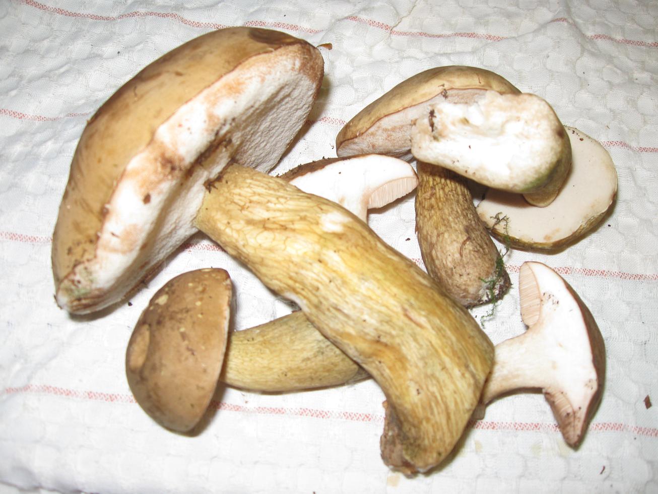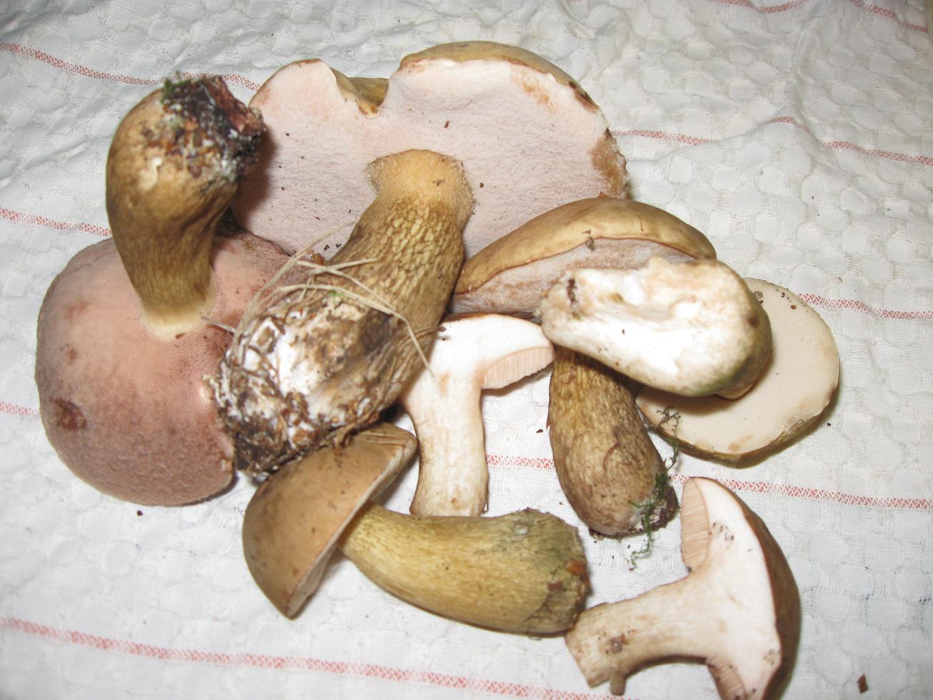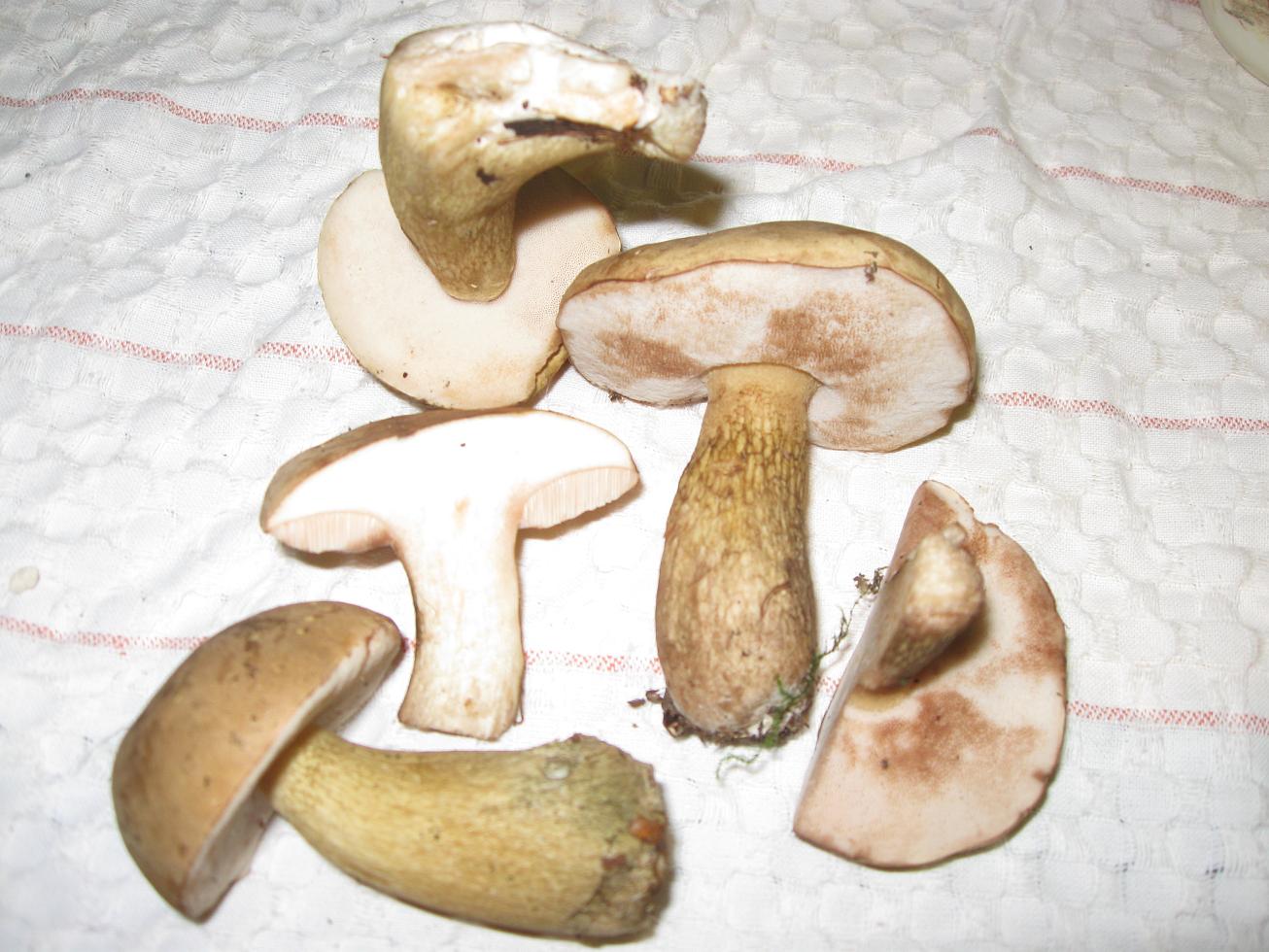 Also diesen Rosaton, den hat nur der eine große, links im Bild. Bei den anderen sind die Röhren wirklich weiss. Wir haben nur den einen großen mitgenommen. Die anderen sind definitiv jünger. Wenn es sich wirklich um Gallenröhrlinge handelt, wiese schmeckt der angeschnittene Pilz dann nicht bitter? Ich dachte, das sei ein eindeutiges Unterscheidungsmerkmal? Helft mir auf die Sprünge.