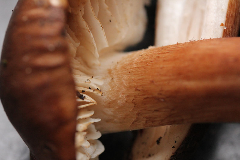 Der Hut und die Rippung passt zu T. fulvum zugegeben gut, aber unser Pilz hatte keinerlei Gelbstich, weder im Fleisch, noch in den Lamellen. Zudem wird bei unserem Pilz der Hut bei Wiederbefeuchtung nicht schleimig, was er bei T. fulvum wohl machen müsste. Und Birke als Baumpartner halte ich an dieser Fundstelle für eher unwahrscheinlich.