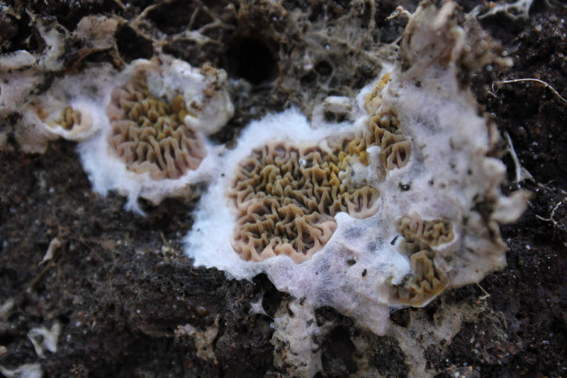 ...der Wilde Hausschwamm, Serpula himantioides oder auch Romells Gewebehaut, Leucogyrphana romellii scheinen mir nach einer Kurzrecherche irgendwie ähnlich auszusehen. Aber was weiß ich schon von solchen Pilzen.