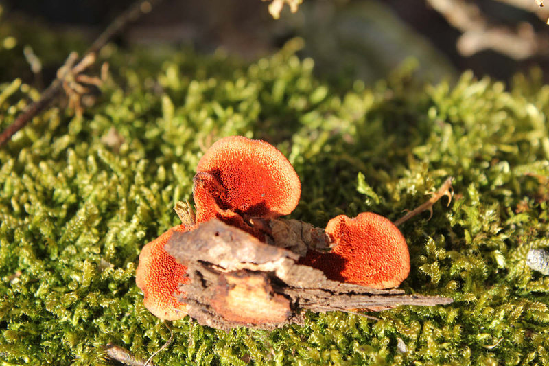 Völlig vertrocknet, aber immer noch schön ziegelrot: Die Zinnober-Tramete, Pycnoporus cinnabarinus