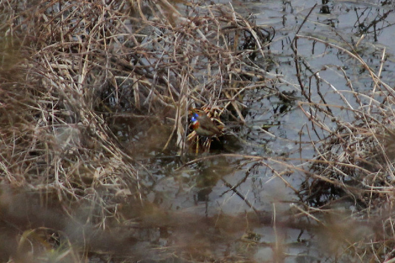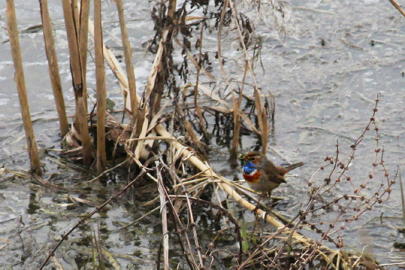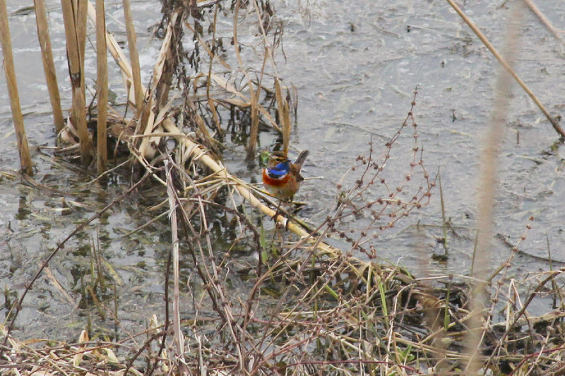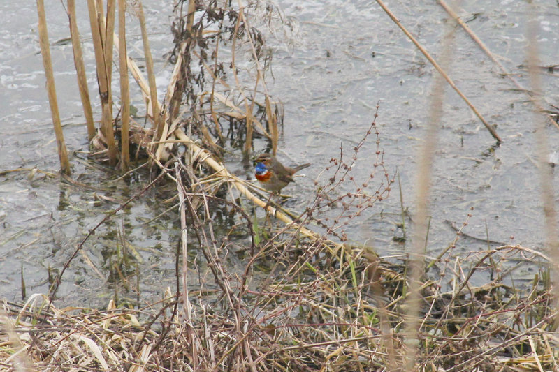 Der kleine braune Geselle mit der leuchtend blauen Brust wuselte im rohrigen Uferbereich geschäftig hin und her, aber immer in sicheren Abstand. Sehr scheu, und schwer zu erkennen.