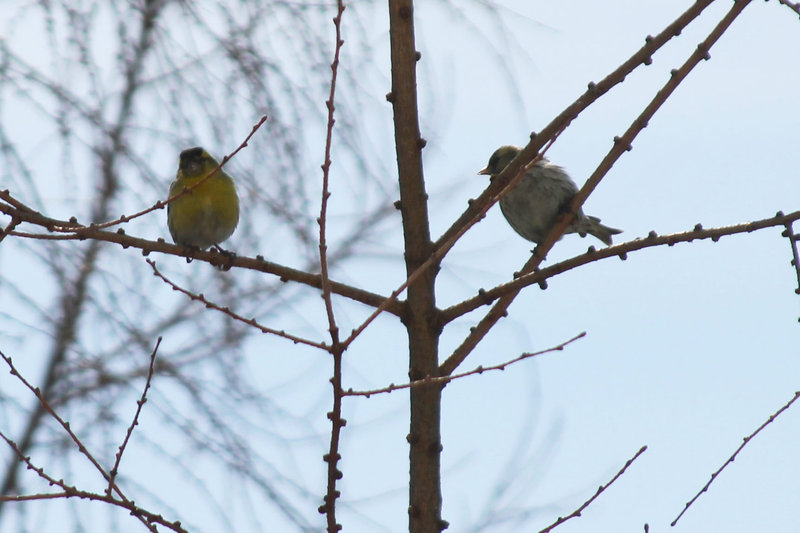 Noch im tiefsten Winter, vor wenigen Tagen in Ostsachsen... farbenfrohe Erlenzeisige - ein Weibchen und ein Männchen...