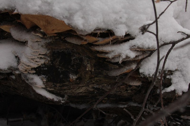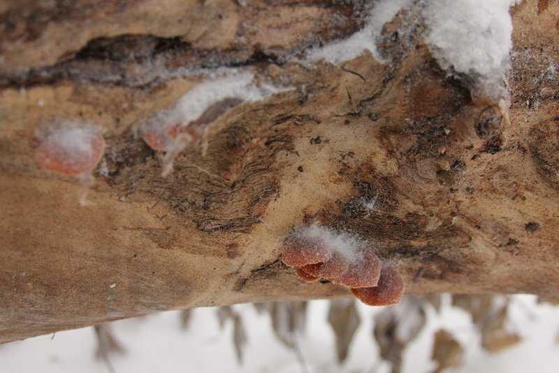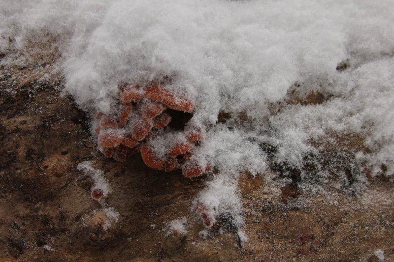 Nach einigem Suchen entdecken wir sie doch noch, an unsere Buchenstamm...eingeschneite, gefrostete Samfüßchen...