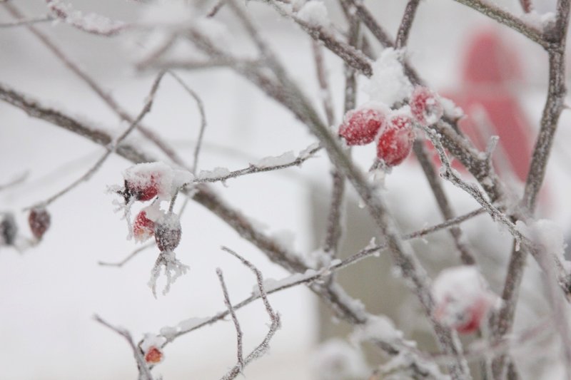 ... auch die Hagebutten zeigen noch Farbe, unter ihrem Mäntelchen aus Reif....