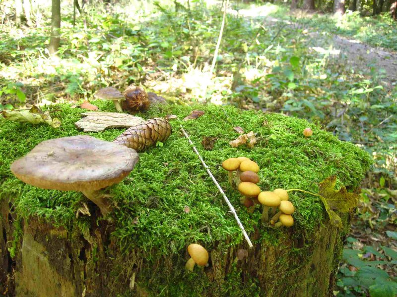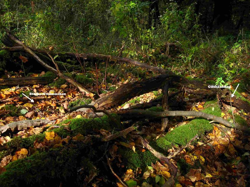 3. Fundstelle Gifthäublinge, zusammen mit Stockschwämmchen: Hier nun der oben erwähnte Fund von Gifthäubling und Stockschwämmchen in einem Totholzbestand, wenngleich nicht am selben Holzstück. Die Standorte sind jeweils im Bild mit Pfeil und Beschriftung gekennzeichnet:
