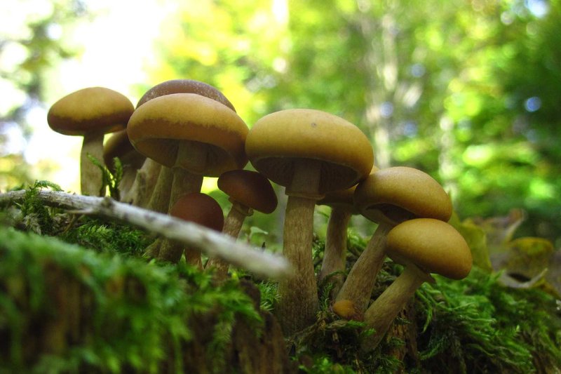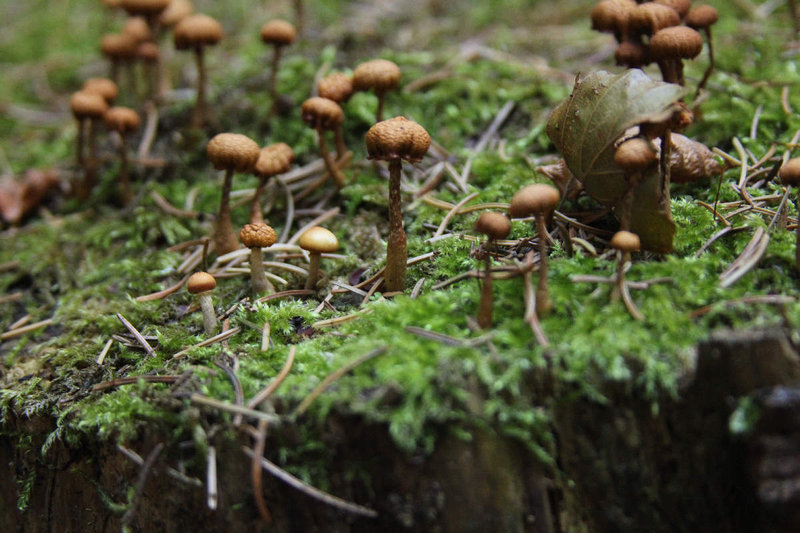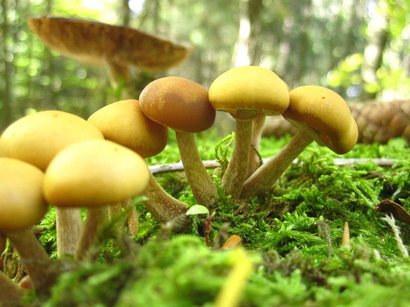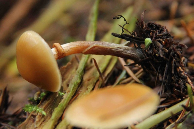 1. Fundstelle: Gifthäubling, büschelig und vereinzelt wachsend auf vergrabenem Nadelholz im Nadelwald am Boden: