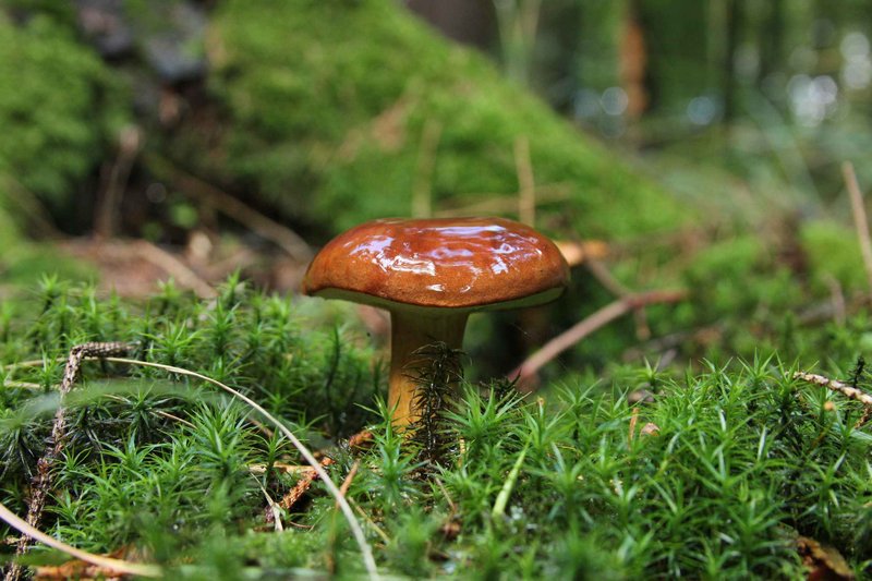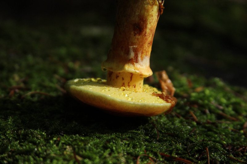 Es bleibt bunt: Der Gold- oder Lärchenröhrling, schön benetzt vom Regen:
