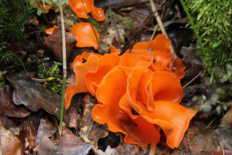 Ein Farbwunder, wohl der orangerote Becherling (aleuria aurantica):