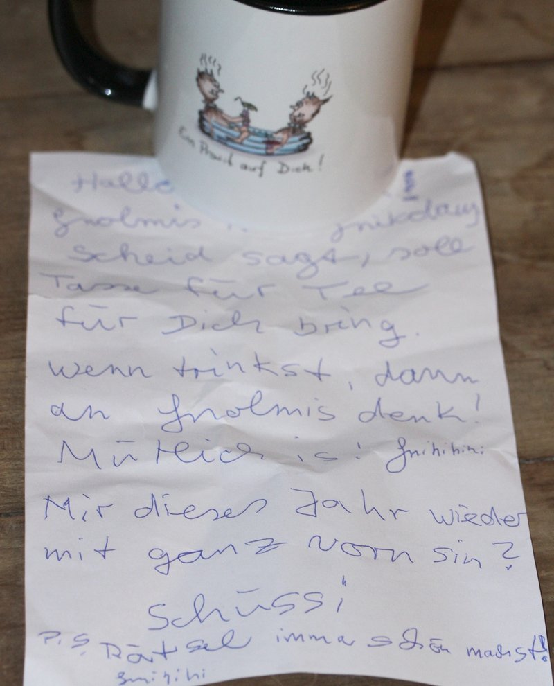 Eine Nikolaustasse und einen goldigen Gnolmen-Brief standen gestern vor der Tür. Ich war ganz gerührt - habe ich ja schon letztes Jahr viel zu viel geschenkt bekommen. Und vor Rätselbeginn dieses Jahr hatte unsere Anja mich bereits mit einem tollen Tee-Kalender verwöhnt. Rasselbande, noch mal an dieser Stelle ein kleiner Hinweis: Ich erwarte keinerlei Geschenke. Ihr macht mir im Rätsel viel Freude, und wenn es mir nicht auch selbst viel Spass machen würde, hätte ich das Rätsel nie 5 Jahre lang machen können. Danke dafür, dass ihr immer so toll dazu beitragt, durch euer lustiges Geschreibsel, eure Bilder, Gedichte, Zaunpfähle. ==Gnolm7.