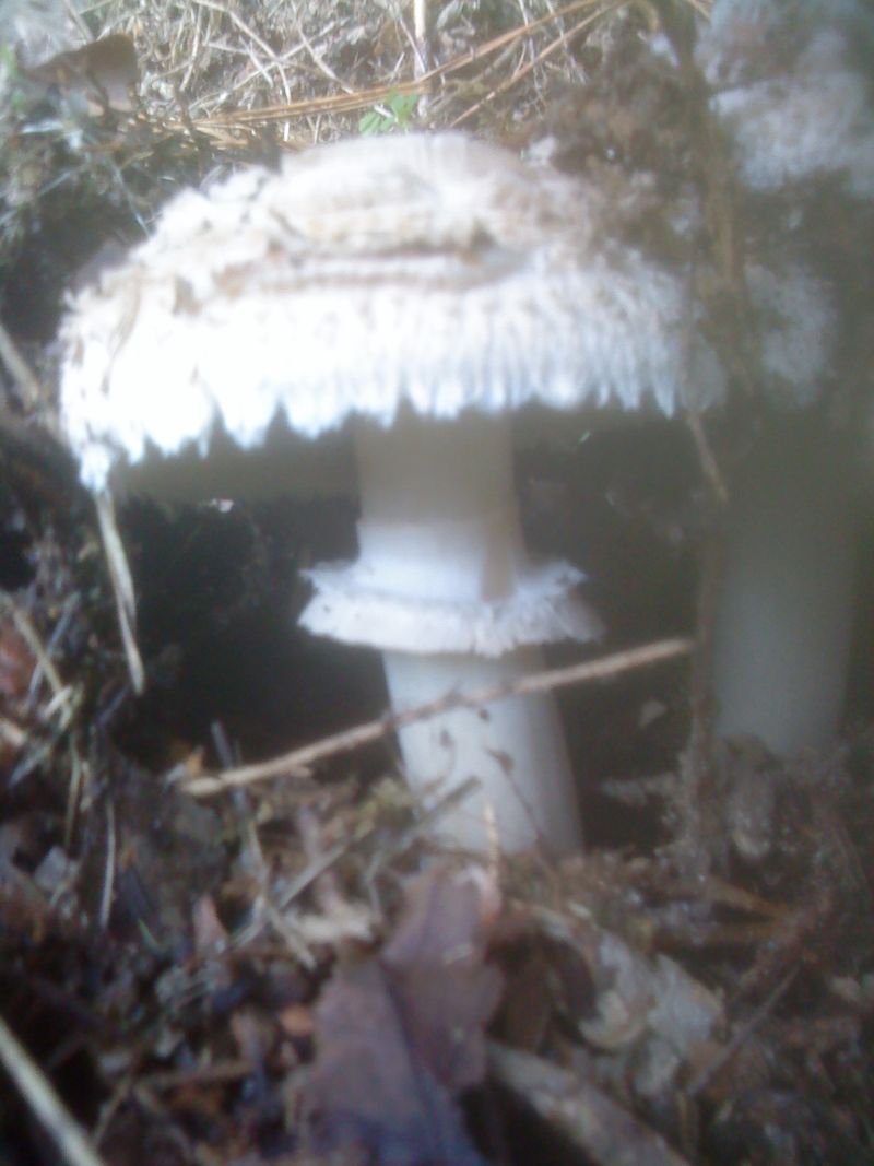Lamellen sind weiß/grau. Sporen sind weiß. Der Stil ist durchgehend dunkel, ich würde sagen braun und innen hohl. Pilz wächst aus einer Knolle. Am Stil befindet sich ein Ring, ob dieser beweglich ist, weiß ich nicht. Beim Anschnitt hat der Hut sich nicht verfärbt ggf. schon zu alt und kurz vorm Verfall (kann das sein).