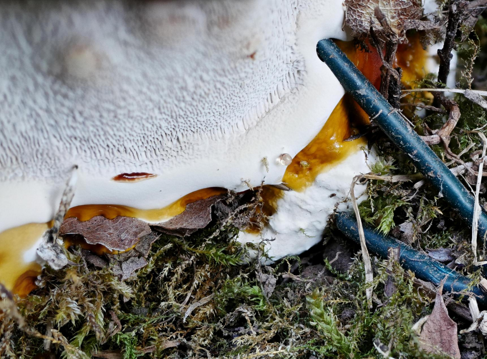 Auf den Porling von gestern ist inzwischen ein Blatt gefallen - und wird umwachsen - ja , der frisst Blätter.