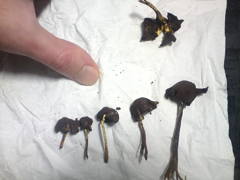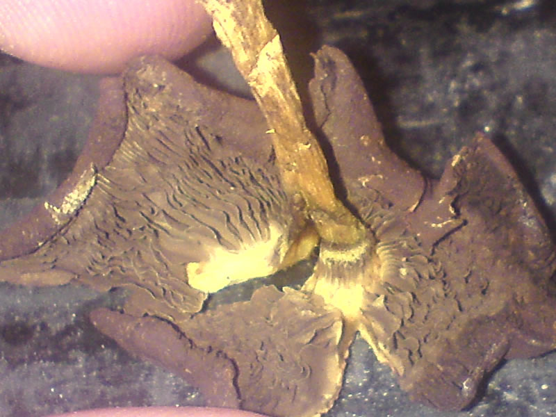 Kein Schleim, jetzt nach 7 Stunden ist der Hut lederartig, fest, die Lamellen leicht gilb-farben (sagt man das?), der Stiel unverändert trotz Druck, festes Fleisch, auch wenn er davon nicht viel hat.