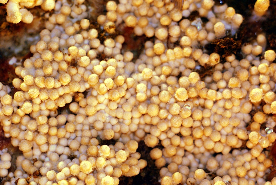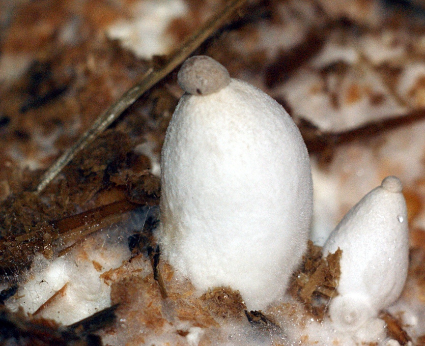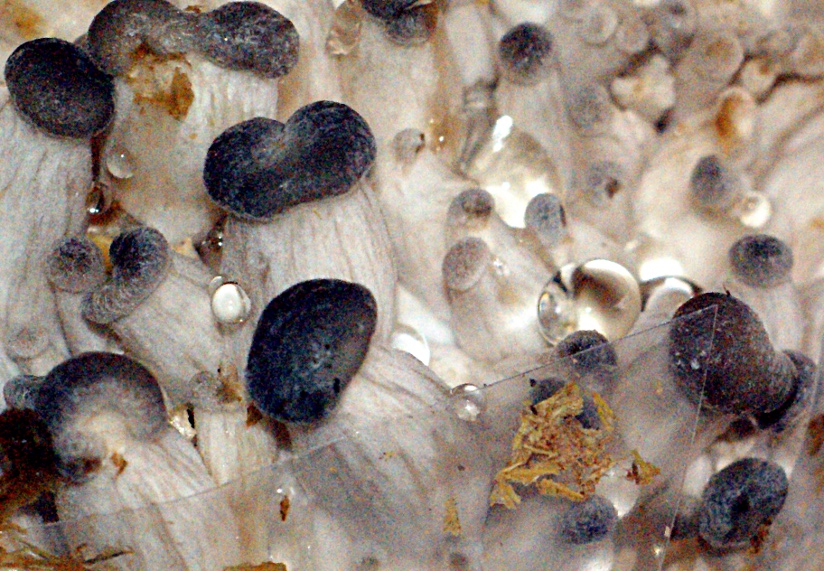 Einer unserer Beutel im Keller bei 11 ° 80 ½LF, dunkel, ist inzwischen auch schon in Fruchtlaune. der andere bildet einen großen Minifrucht-Rasen. Es scheint als ob es wir lieber kalt haben wollen, die Fruchtkörper, diesen Winzlingen auf dem Beutel im Bad bei Licht, 28 ° 75%LF gefällt es garnicht, sie sind recht trocken.