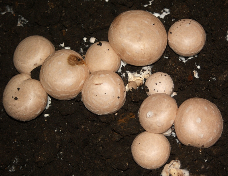Danach durften wir uns erholen. Im Keller bei 12-14 °C und schöner feuchter Atemluft konnten wir nun wachsen. Ein kleines Fenster versorgt uns mit Frischluft. Damit wir keine kalten Füße bekommen stehen die Beutel auf Spankistchen oder auf einem Bratgitter, unter dem ein feuchtes Tuch liegt. 4 Wochen haben wir uns an dem guten Substrat gelabt und wir zeigten unserem Ziehvater mit ersten weißen Stellen, daß es uns gut geht.